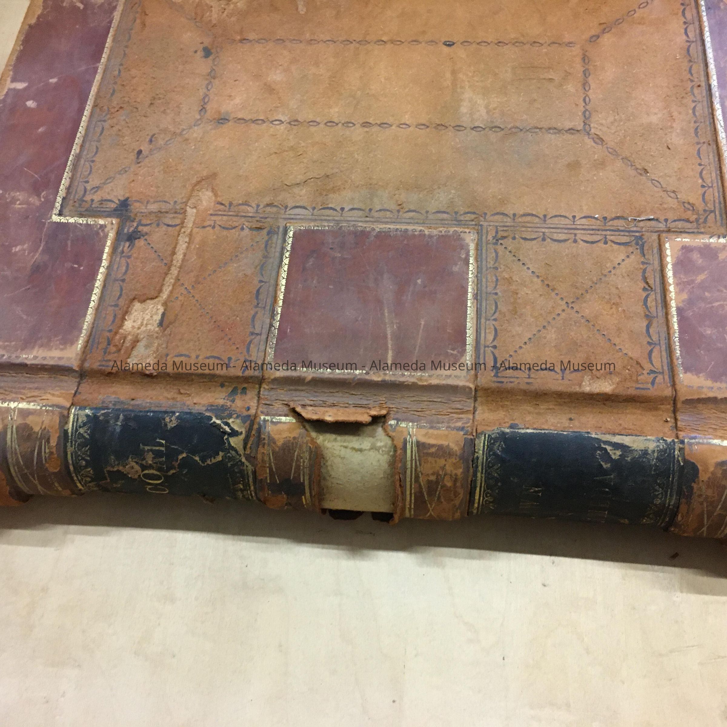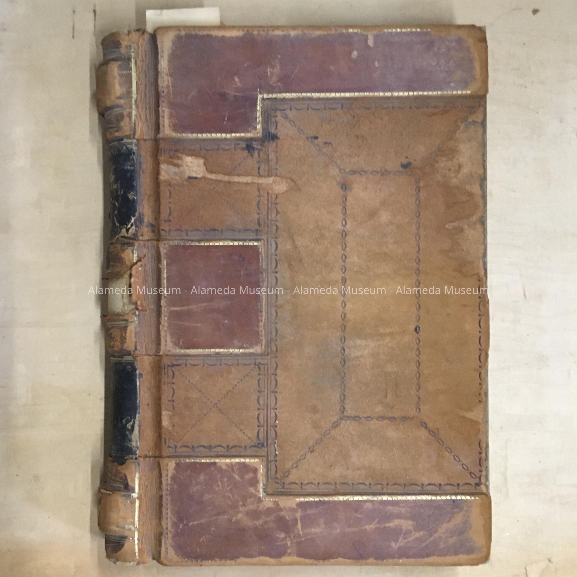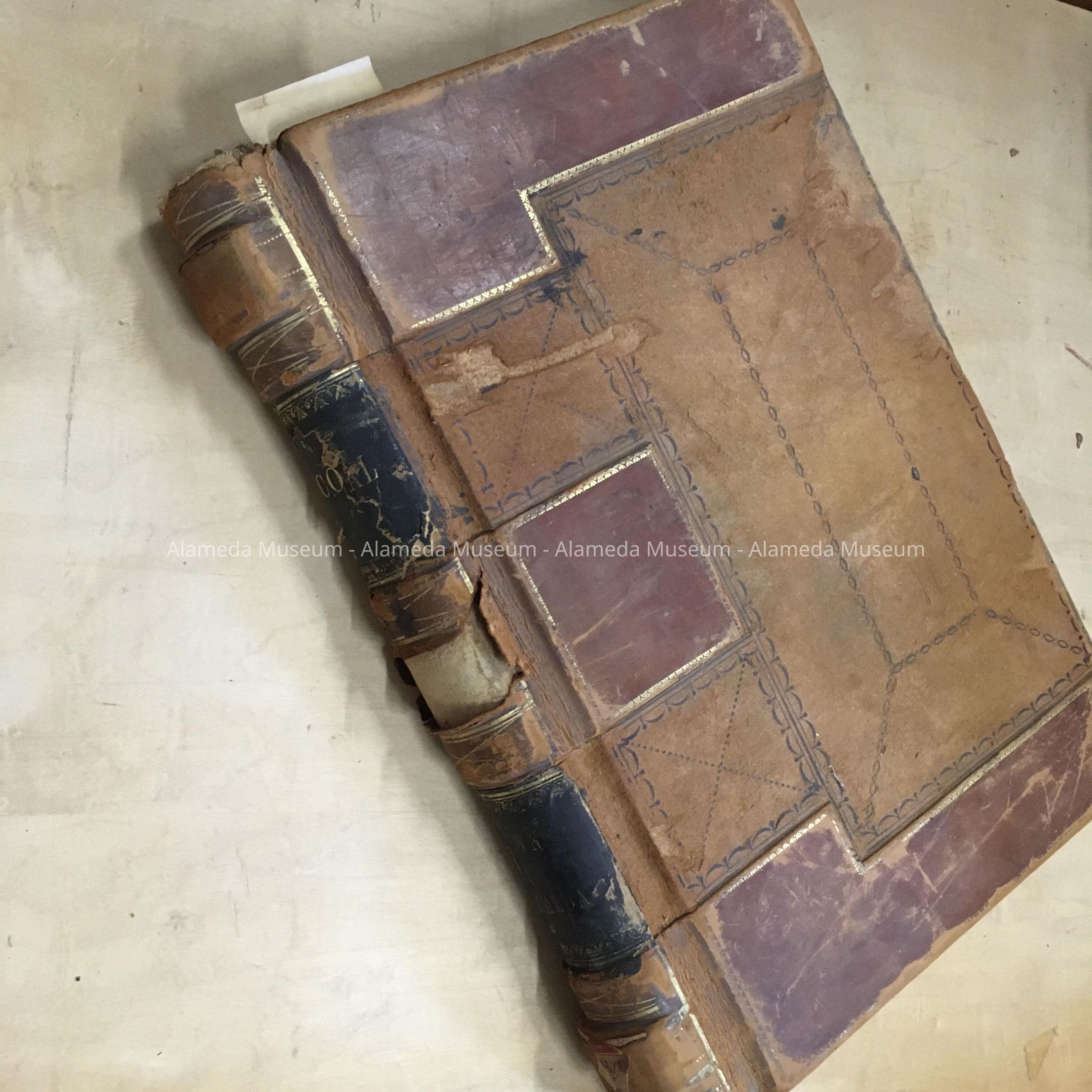 HARD-BOUND VOLUME, WITH COVER OF TWO SHADES OF BROWN LEATHER, ACCENTUATED WITH BLACK AND GOLD. SPINE HAS INCISED GOLD LETTERING, "RECORDS" AND "TOWN OF ALAMEDA."