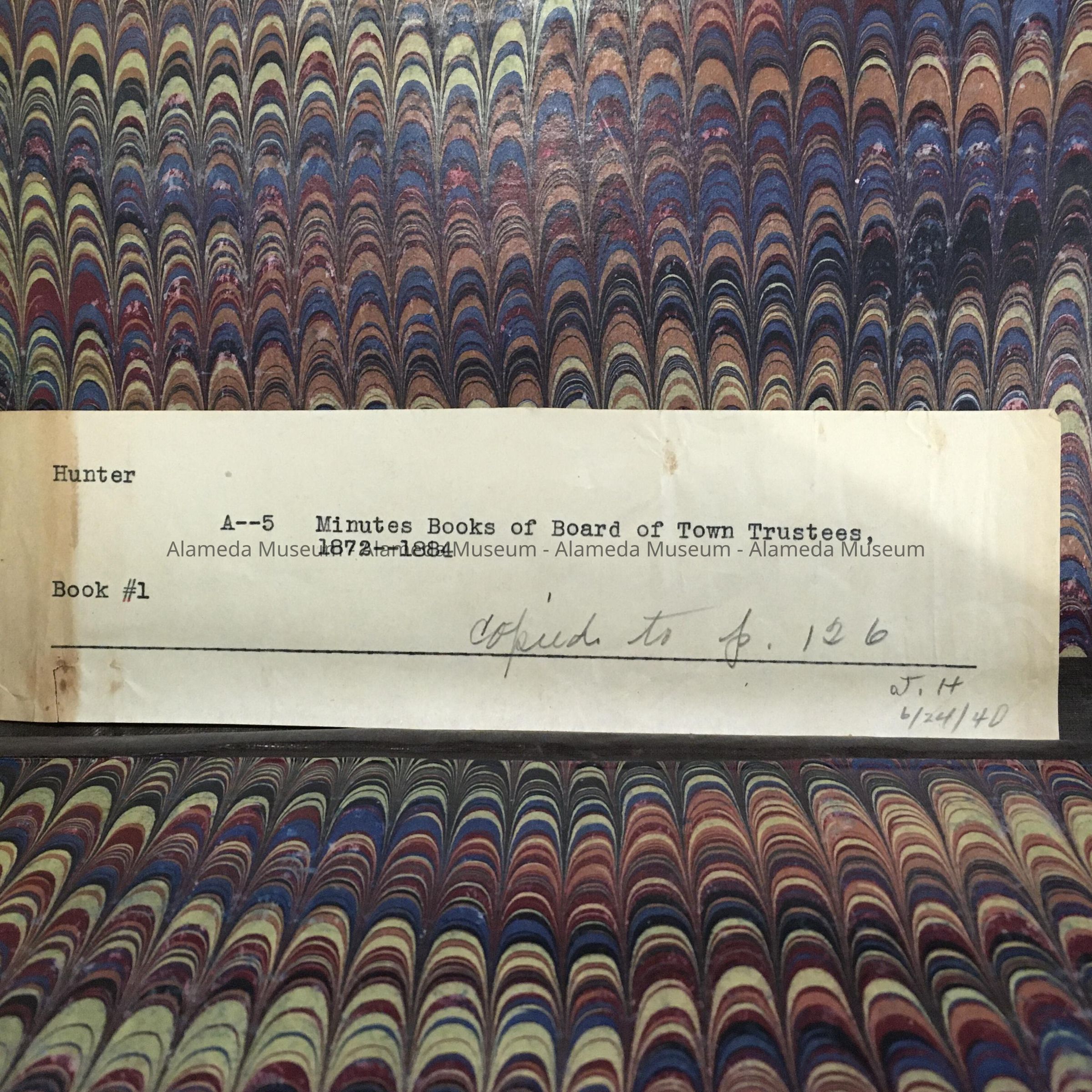 HANDWRITTEN MINUTES OF THE BOARD OF TOWN TRUSTEES, ALAMEDA, FOR THE PERIOD 1872-1884. BEFORE OUR PRESENT FORM OF CITY GOVERNMENT, IN 1907 ALAMEDA WAS GOVERNED BY A BOARD OF FIVE TRUSTEES.