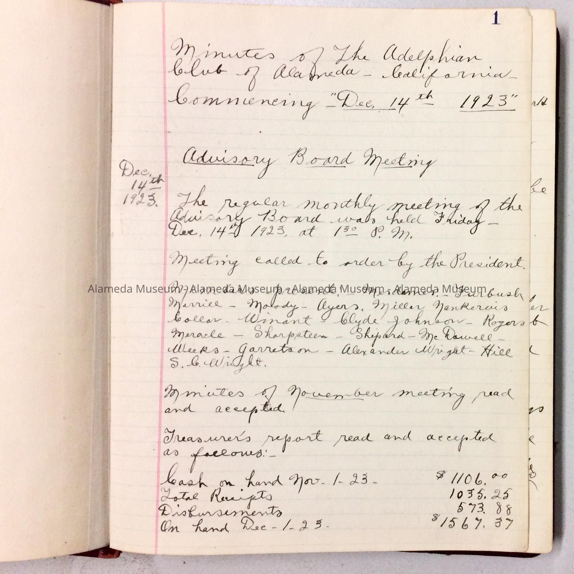 HANDWRITTEN MINUTES OF ADELPHIAN CLUB MEETINGS FROM DECEMBER 14, 1923 TO DECEMBER 10, 1927.