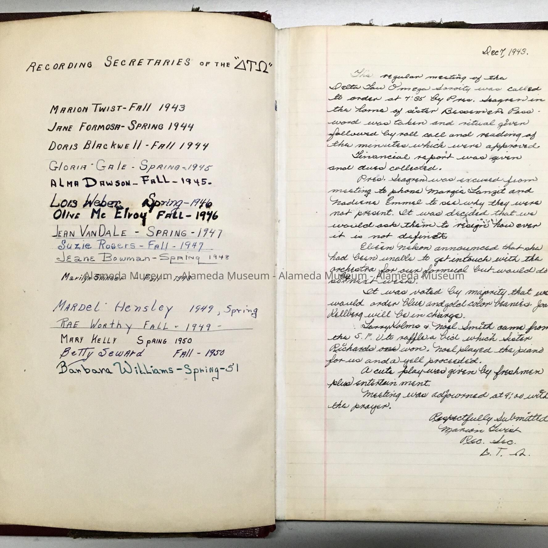 Minutes Book of the Alameda High School Sorority 'Delta Tau Omega' 1943-1951Entry/Object ID