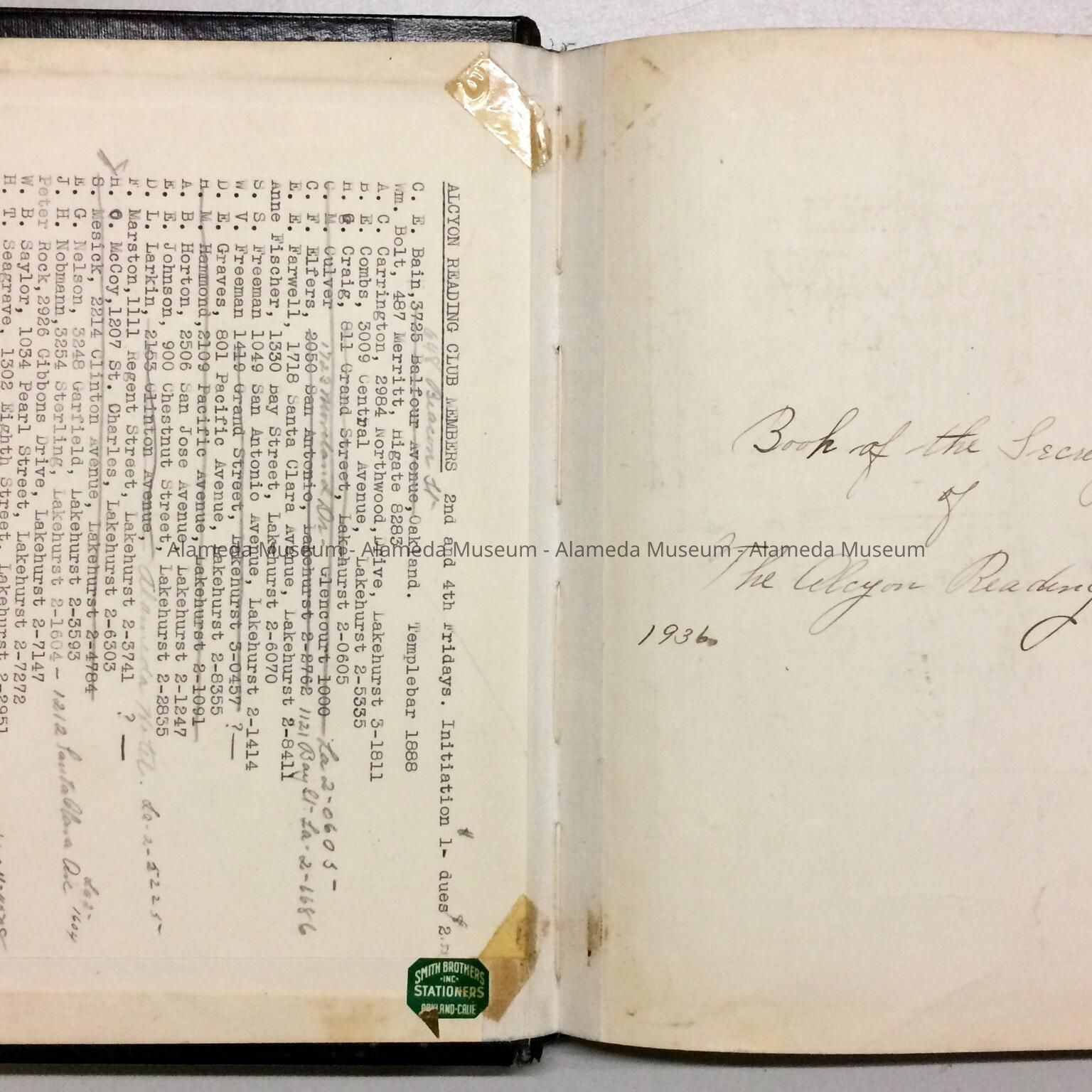 HISTORY OF OBJECT: ATTENDANCE AND MINUTES OF THE ALCYON READING CLUB, WHICH MET THE SECOND AND FOURTH FRIDAYS. MINUTES TAKEN FROM 1936 THRU 1942. ALSO INCLUDED IS A ROSTER OF MEMBERSHIP, ADDRESSES, AND TELEPHONE NUMBERS. THESE MINUTES WERE PRESENTED TO THE ALAMEDA HISTORICAL SOCIETY PRIOR TO 1971 AND NOT CATALOGED AT THAT TIME.