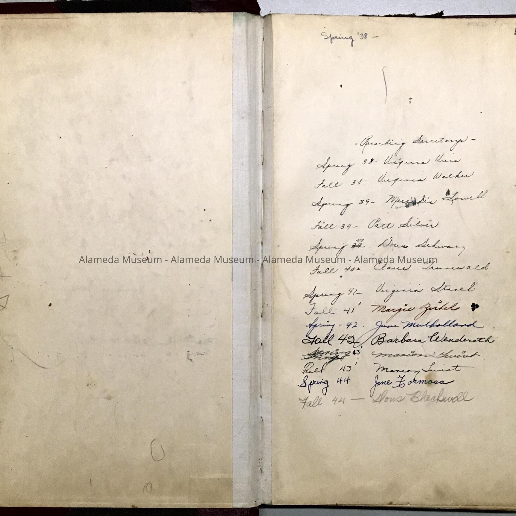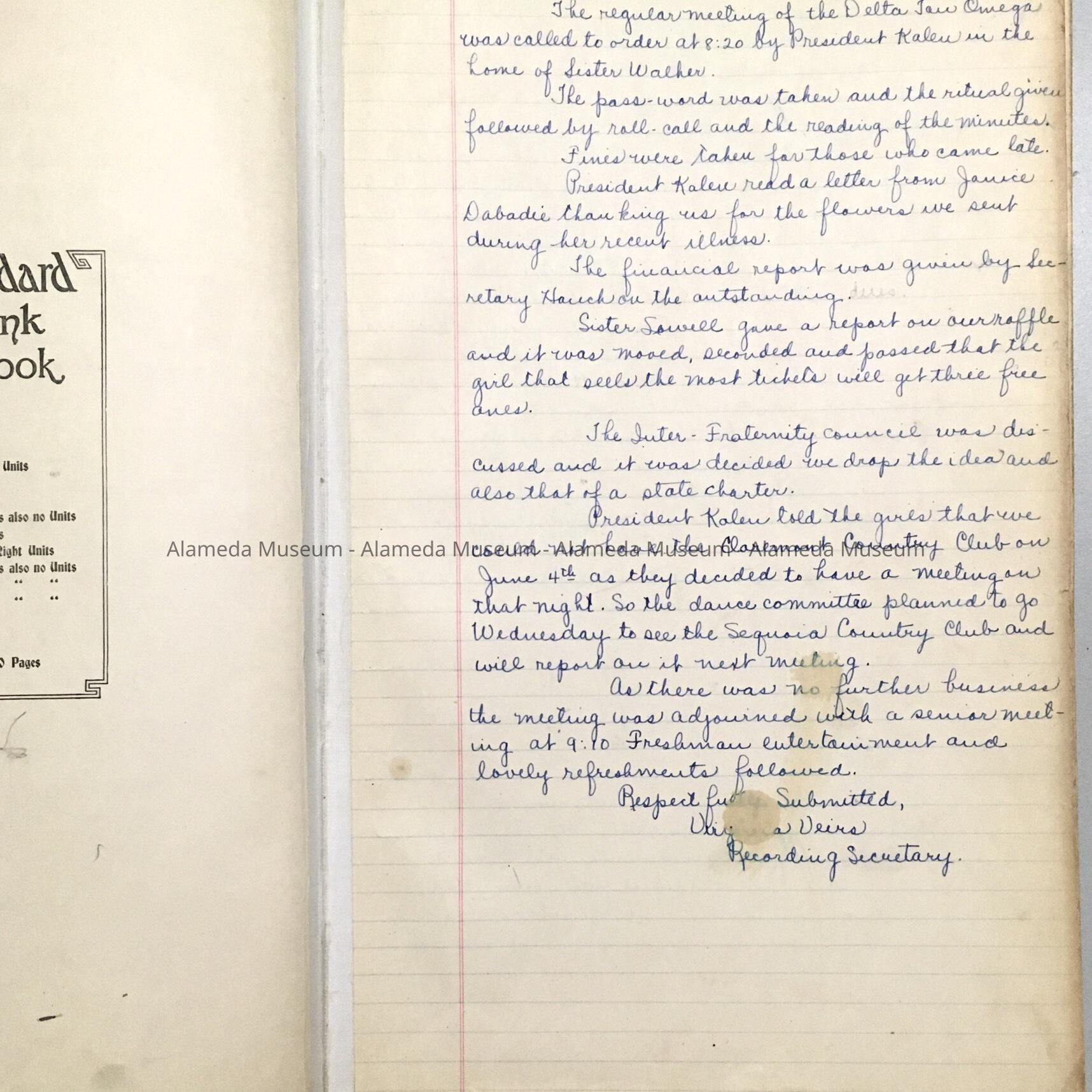 Minutes of the Alameda High School Sorority Delta Tau Omega, aka Delthenian Club. Back portion of ledger contained a role sheet giving membership and attendance.