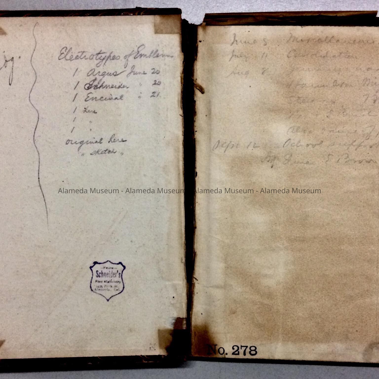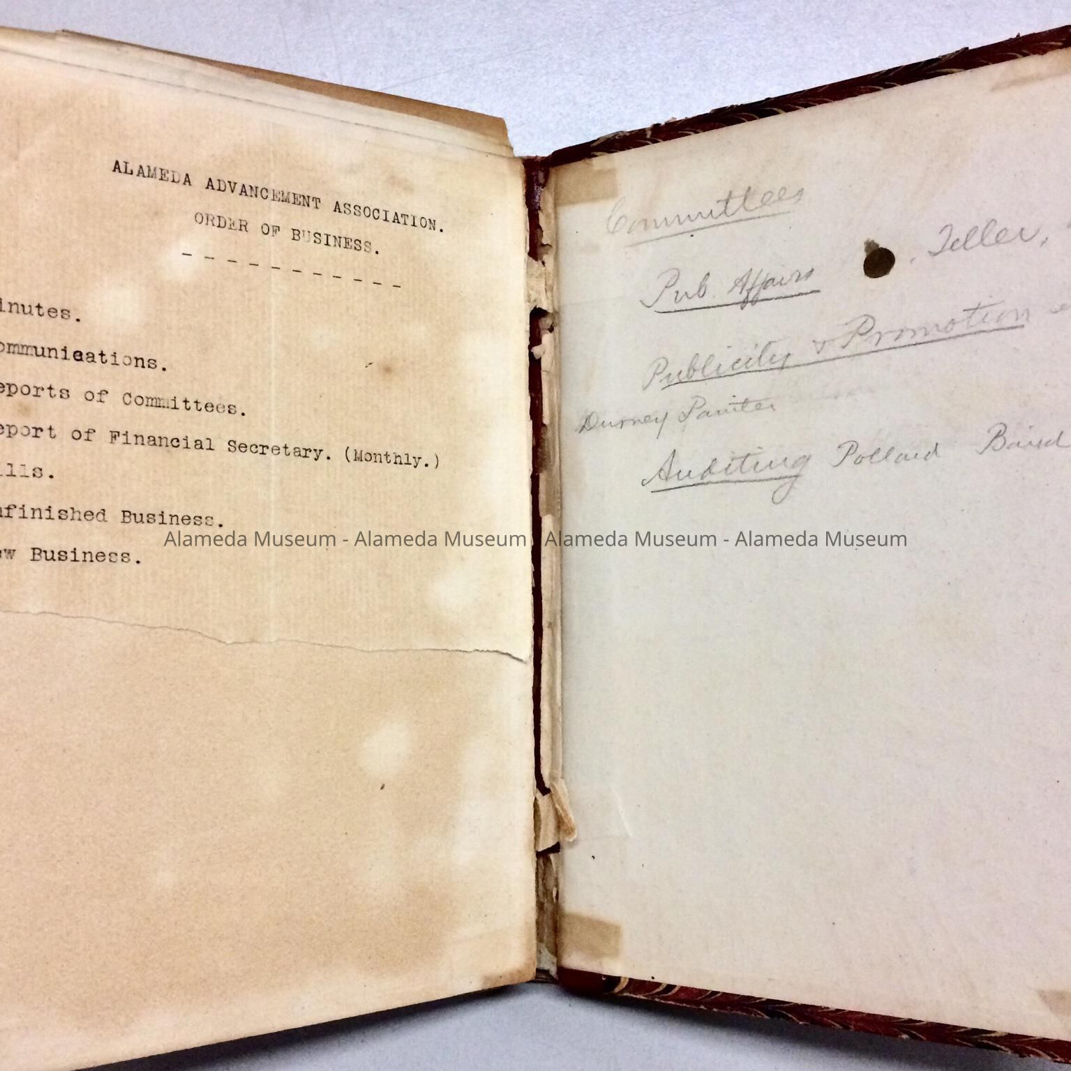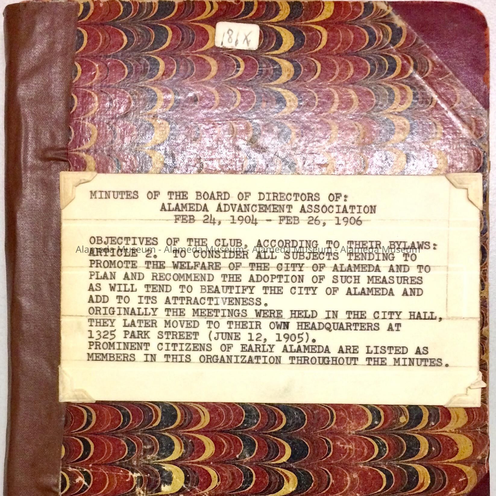 MINUTES OF THE BOARD OF DIRECTORS, ALAMEDA ADVANCEMENT ASSOCIATION, FEBRUARY 24, 1904 THRU FEBRUARY 26, 1906. THE OBJECTIVES OF THE CLUB WERE TO RECOMMEND TO THE CITY OF ALAMEDA MEASURES TO BEAUTIFY THE CITY IN THE FORM OF BUILDINGS, ROADS, ETC. MINUTES WERE GIVEN TO THE ALAMEDA HISTORICAL SOCIETY PRIOR TO 1971, NUMBERED "181-X," AND HERETOFORE NOT OFFICIALLY CATALOGED.