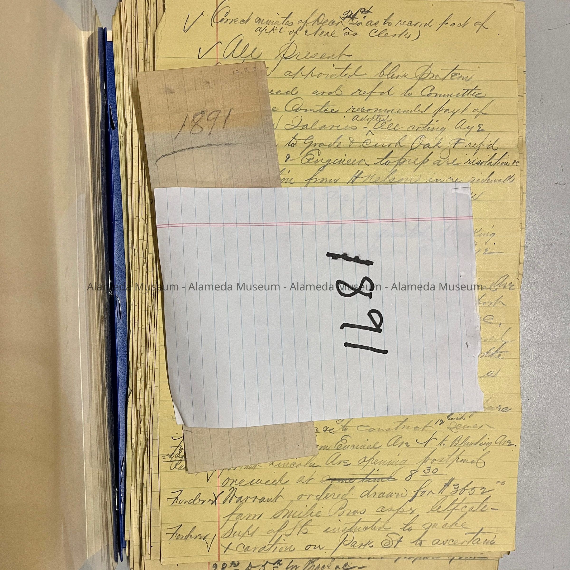 HISTORY OF OBJECT: HANDWRITTEN MINUTES FROM THE BOARD OF TRUSTEES WHO AT ONE TIME GOVERNED THE CITY OF ALAMEDA AND ACTED AS QUASI CITY COUNCIL FOR THE PERIOD JANUARY THRU DECEMBER 1891.