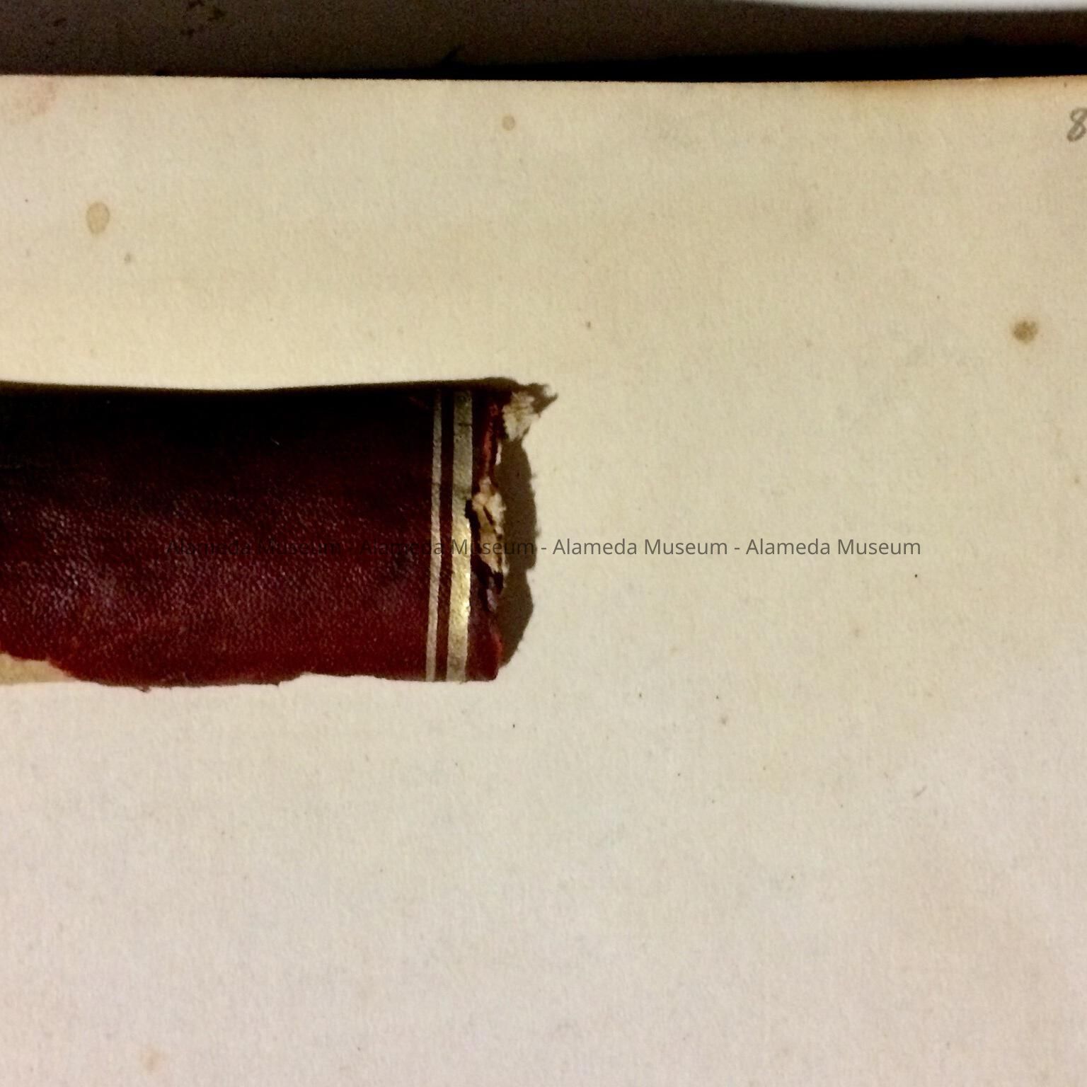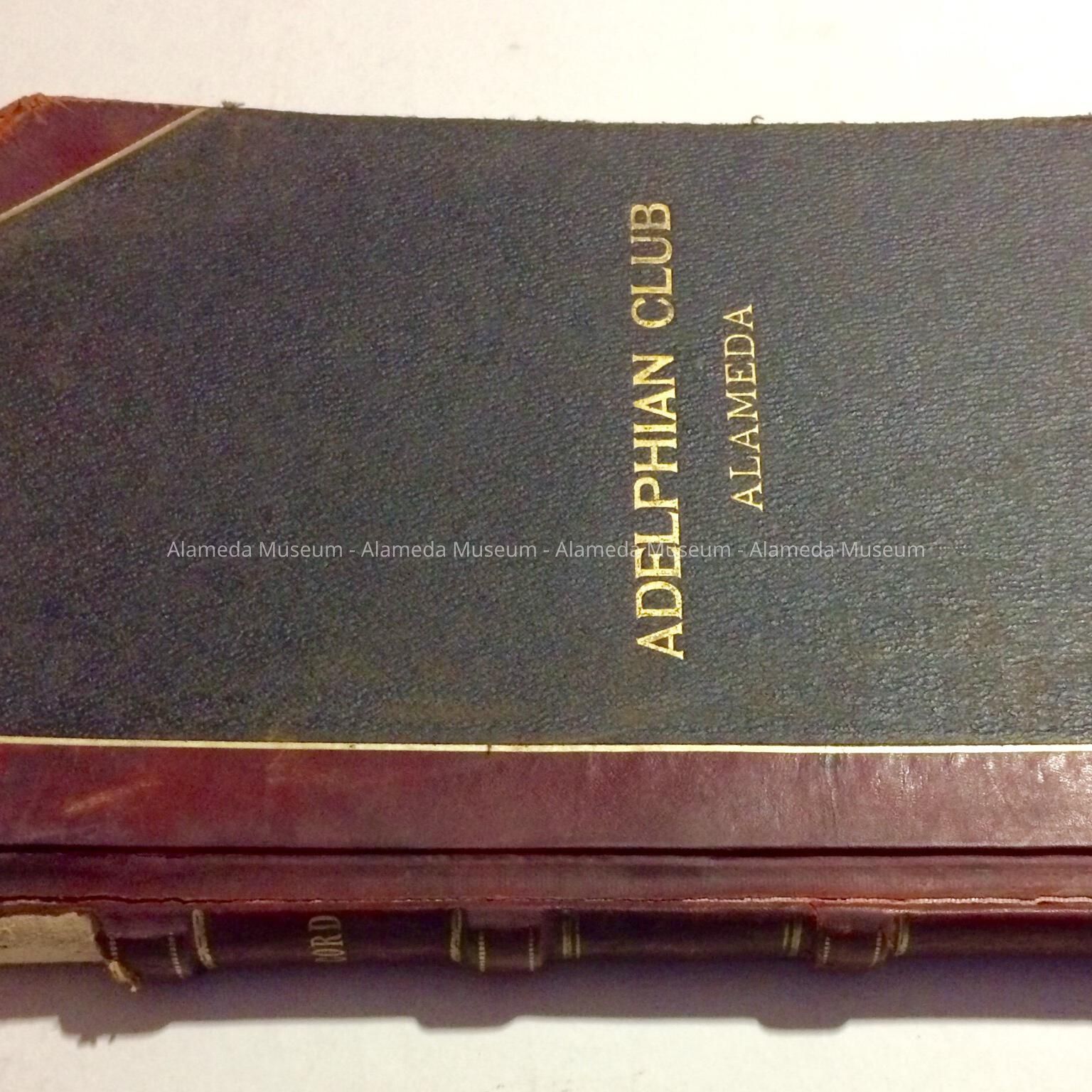 Description: Imitation black leather (accentuated with red) hardcover record book with incised gold lettering on cover stating "Adelphian Club-Alameda."