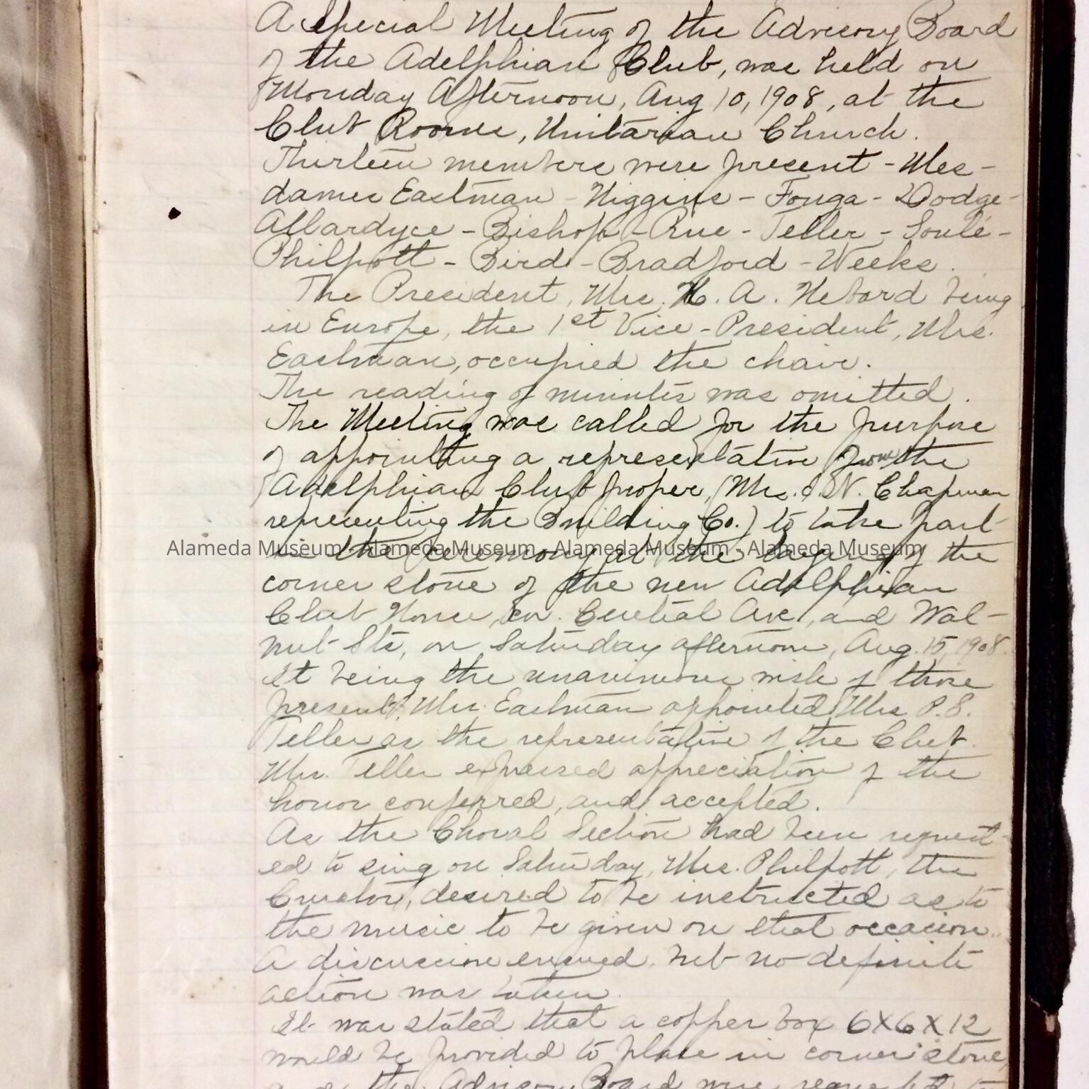 Record book containing handwritten minutes of the Adelphian Club from August 10, 1908 to Mar 8, 1912. An important aspect of the minutes concern the laying of the corner stone of the Adelphian Club building, which
