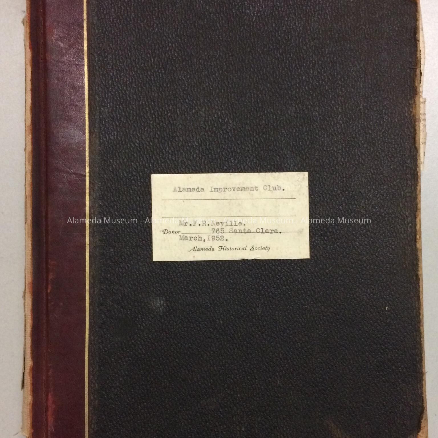 MINUTES OF THE ALAMEDA IMPROVEMENT CLUB (HANDWRITTEN) FROM MAY 27, 1909 THRU SEPTEMBER 4, 1916. AN EARLY SECRETARY OF THE CLUB WAS MR ALEXANDER MACKIE. MINUTES WERE GIVEN TO THE ALAMEDA HISTORICAL SOCIETY IN MARCH OF 1952, NUMBERED "164-A-X," BUT HERETOFORE NOT OFFICIALLY CATALOGED.