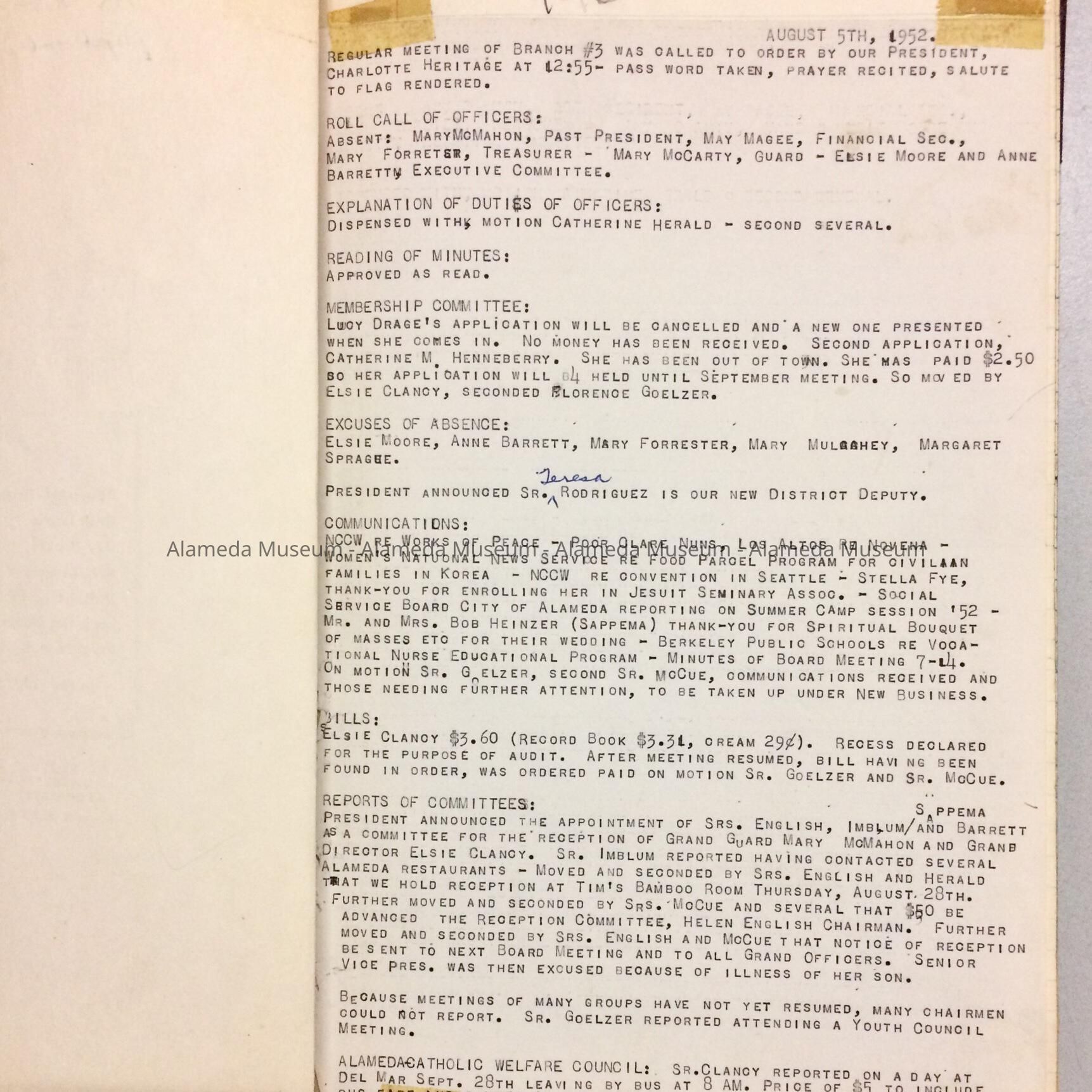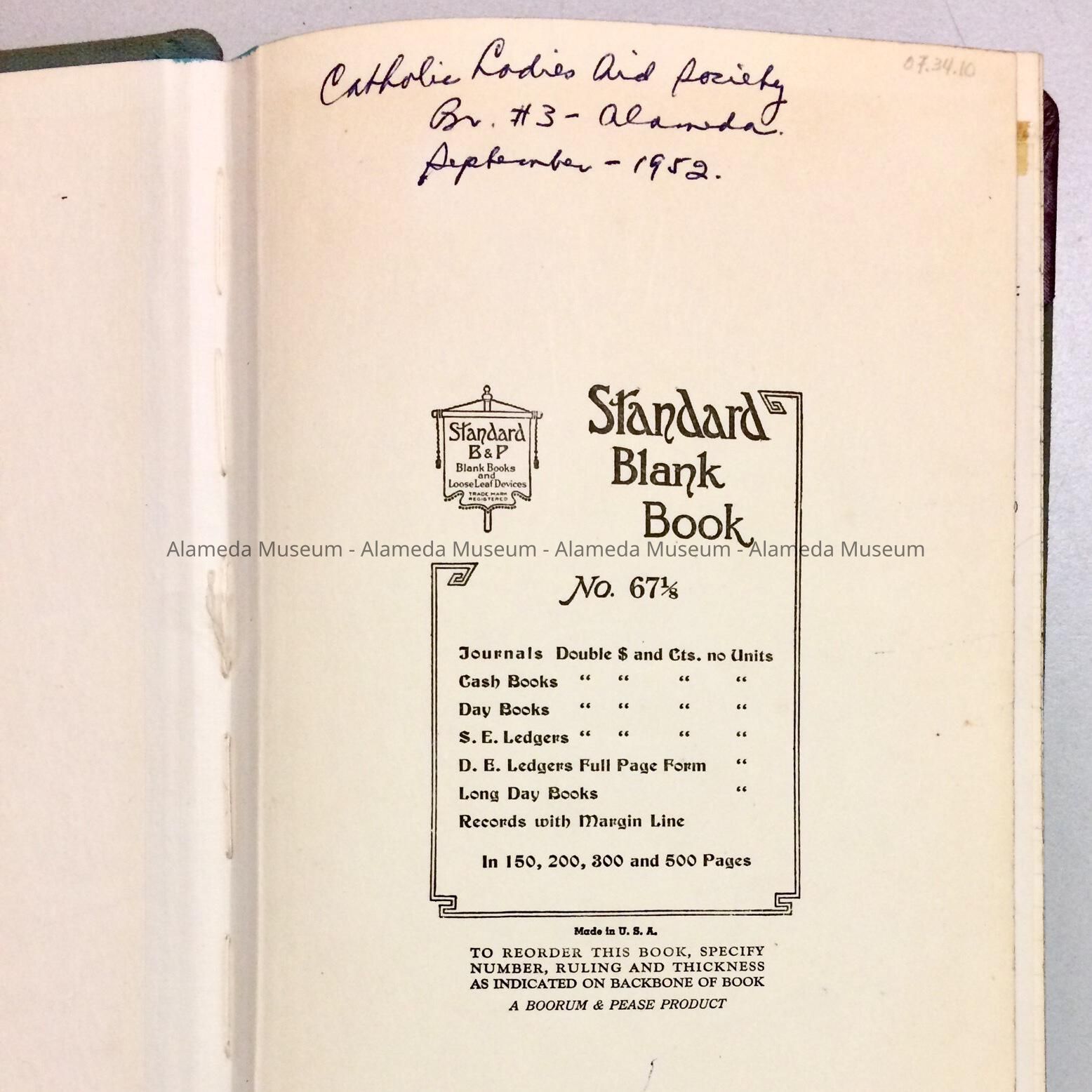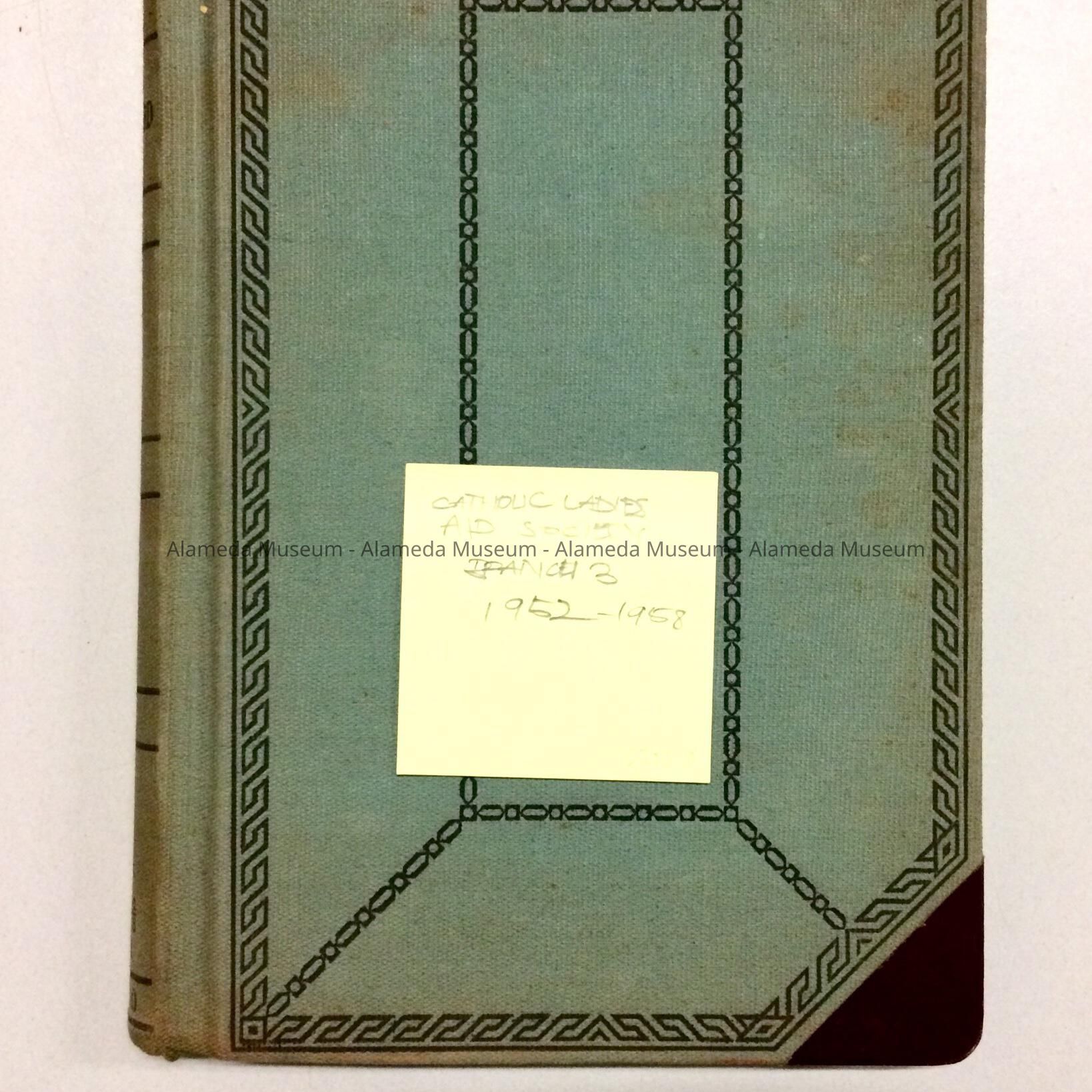 HISTORY OF OBJECT: LEDGER CONTAINING MINUTES OF THE CATHOLIC LADIES’ AID SOCIETY, ALAMEDA, BRANCH 3, 1952-1958.