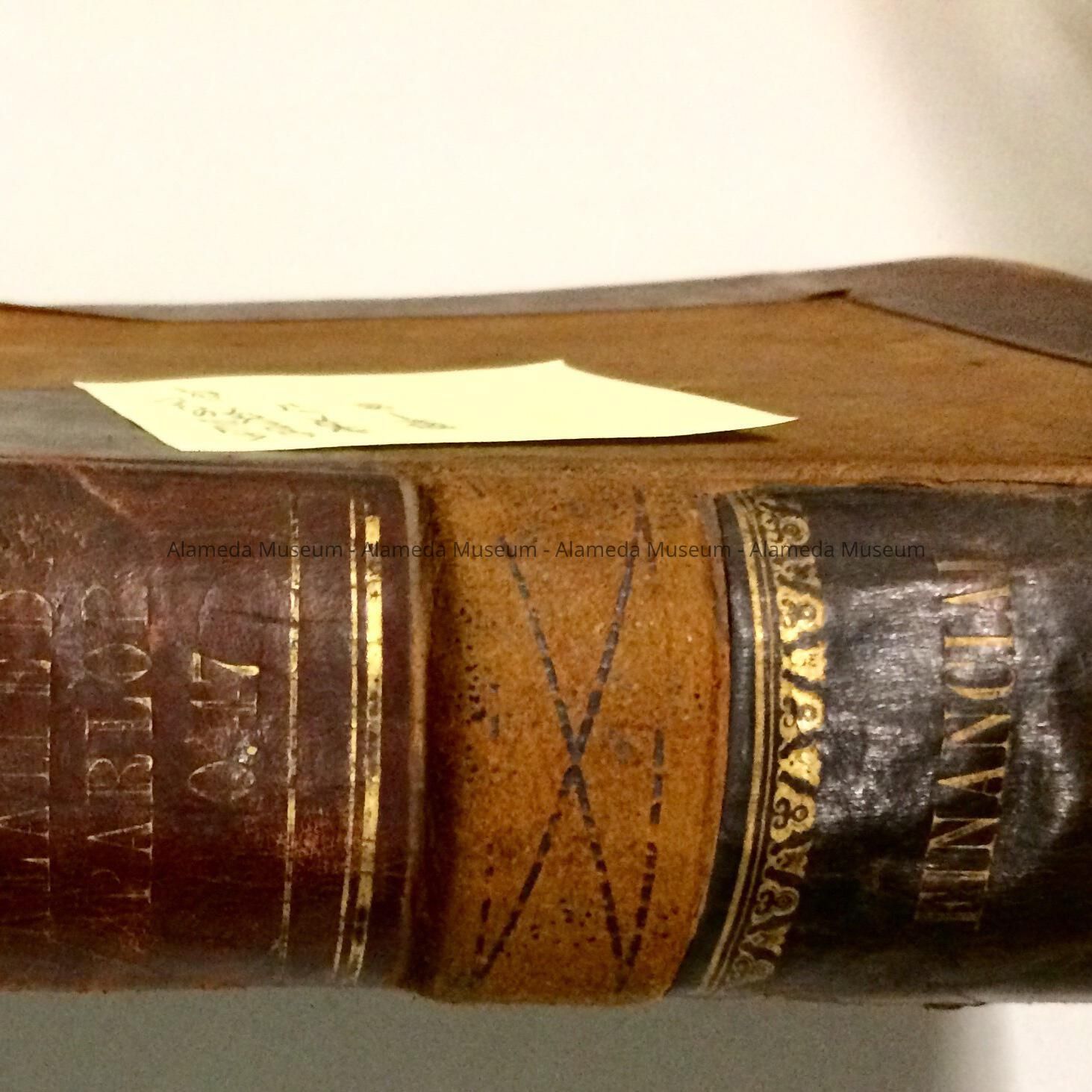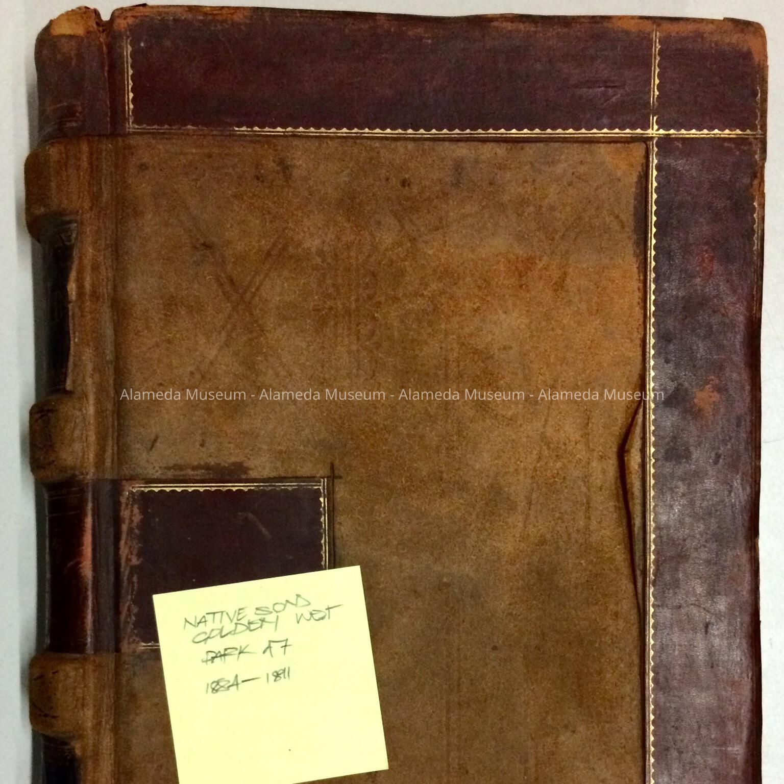 DESCRIPTION: HARD-BOUND BOOK WITH COVER OF BROWN-COLORED LEATHER, TRIMMED IN WINE-COLORED LEATHER AND GOLD ACCENTS. CONTENTS ARE HANDWRITTEN ENTRIES.