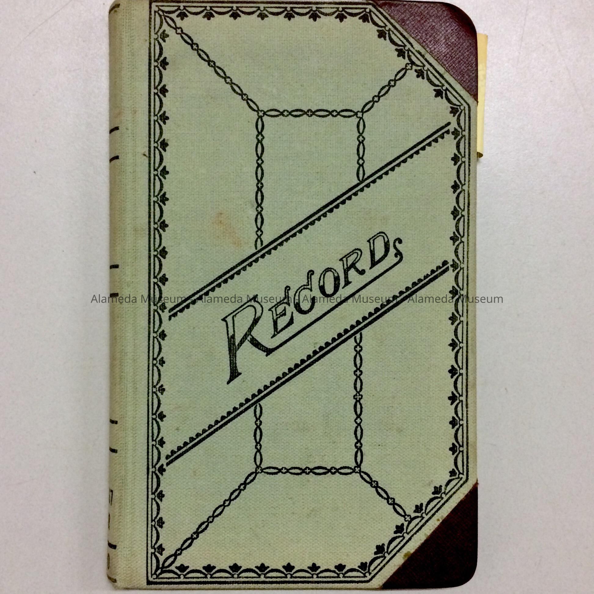 DESCRIPTION: A HARDCOVER ACCOUNT BOOK WITH CAPTION, "RECORD" IN BLACK TYPE ON A PALE GREEN BACKGROUND. THE CONTENTS ARE HANDWRITTEN IN INK AND THE MINUTES RECORDED ON LINED PAPER.
