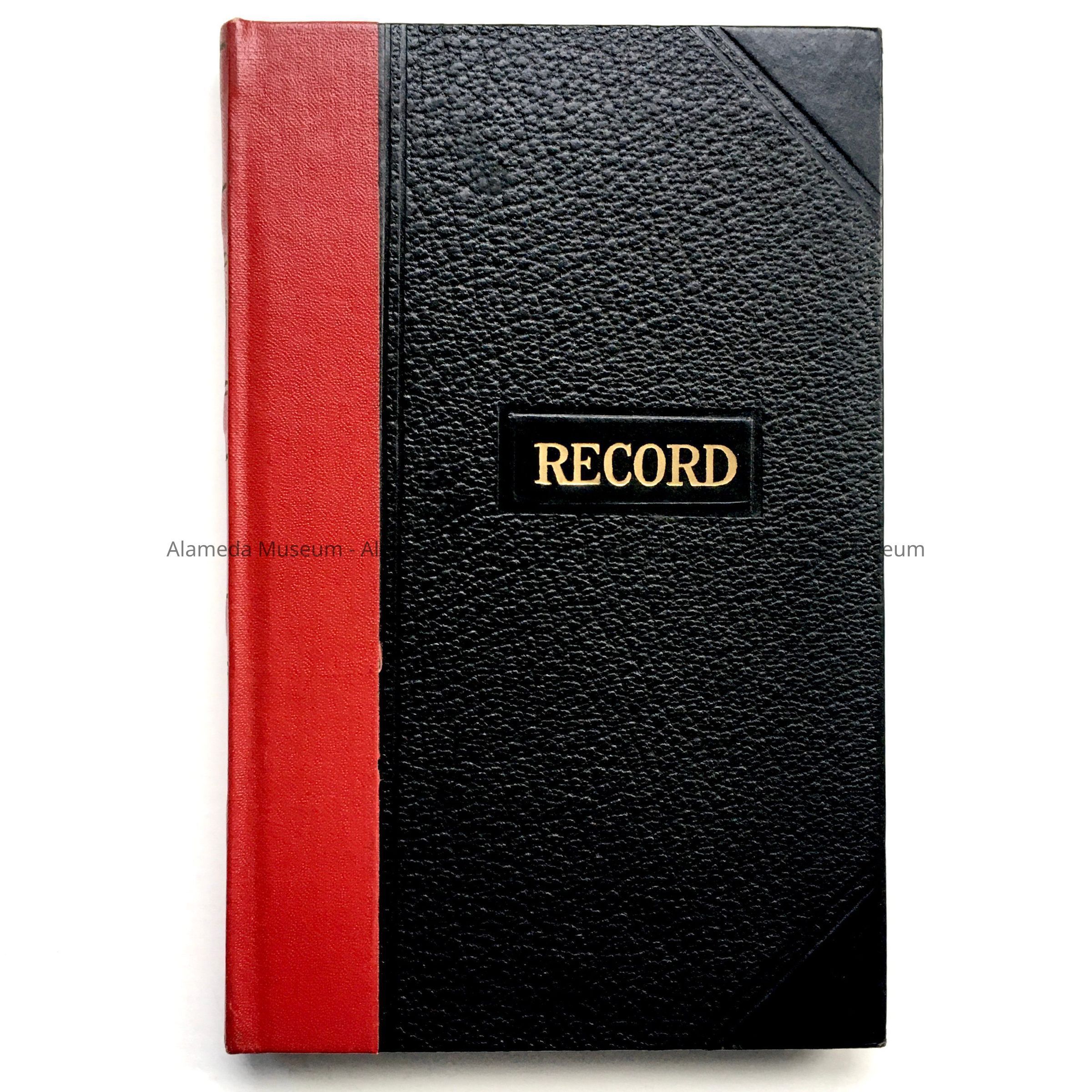 HARD-BOUND LEDGER BOOK, CONTAINING HANDWRITTEN NOTES. COVER HAS IMITATION BLACK LEATHER COVER, TRIMMED IN IMITATION RED-COLORED LEATHER. ON THE COVER AND SPINE IN GOLD-COLORED TYPE IS THE WORD, "RECORD."