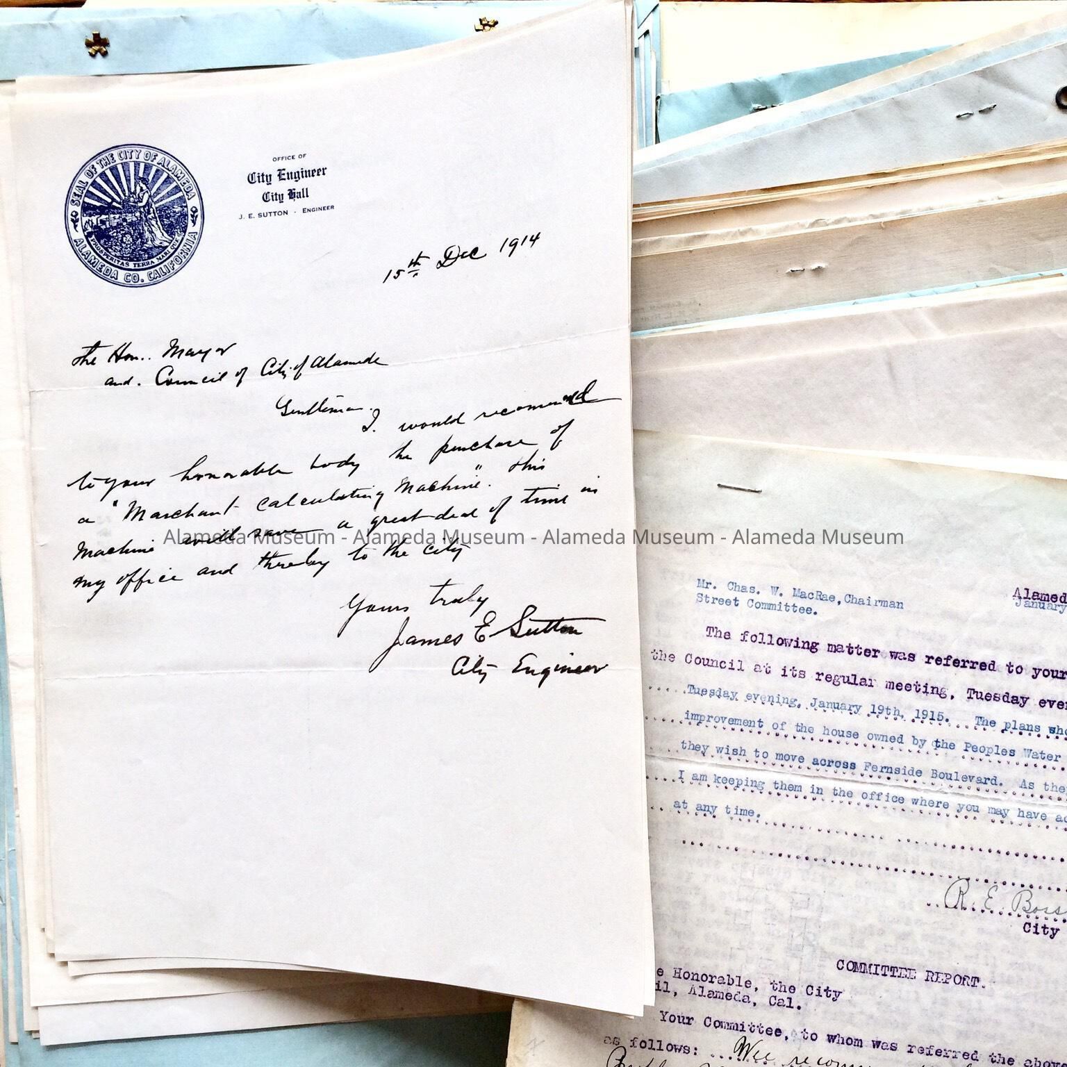 Details: #2451: Nov. 12, 1914 Chamber of Commerce letter requesting garbage cans be placed near polling places for future elections; #2452: petition to construct a sewer in Lincoln Ave; from Versailles to the East Cohen Line; #2543: negative response to request by city to create sidewalk on Clement Ave.; #2454: 1913-1915 correspondence about street improvements on Park Street between Buena Vista and the Park Street Bridge; #2455: proposed ordinance suggested by Police Chief Conrad, prohibiting the use or possession of silencers; #2456: Street Superintendent V.M. Frodden suggesting an ordinance to create a contiguous concrete curbing on Santa Clara between Park and Webster, and to issue an ordinance, requiring concrete contractors to apply for approval, and to stamp their work; #2457: F. J. Croll requesting a filing cabinet for assessing automobiles; #2458: Dec. 1914 recommendation by James E. Sutton, City Engineer, to buy a Marchant calculating machine. [now cataloged in the collection as 81.119.1]; #2459: Southern Pacific Co. reply to complaints and suggestions; #2460: 1915 petition to move and improve the house owned by the Peoples Water Company across Fernside Boulevard; #2641: applications for gratuitous peddler’s licenses; #2642: Henry Meyers, for the Advisory City Planning Commission, about the cost of beautifying Santa Clara from Park to Webster [see #2498] and cost of improving playgrounds; #2643: petition from Bay Farm Island residents demanding lights and power from the Electric Light Plant; #2464: miscellaneous 1913 - 1914 documents: -1: J.E. Breitweiser, 1130 Regent St., urging to use wells, and not publicly provided water from Lake Chabot; -2: Charles L. Pryal, of the Municipal Ownership League of California, 945 Park St., comparing the Municipal Light Plants of Alameda and Pasadena and suggesting lower rate; -3: Alaska Packers thanking for notification of a new outlet for the city sewer emptying into the basin at the shipyard; -4: Auditor’s office alerting to a mistake about a duplicate bill; -5: John. A. Cloud applying for City Clerk; -6: W.H. Pollard, 1438 Park Street, alerting to expiration of insurance policy; -7: application by Charles E. Hewes for City Engineer, vacant by the death of I.N. Chapman; -8: letter from Street Superintendent about a (not included) plan for a concrete wall, stairway, and ornamental work proposed for the south end of Grand Street; -9: letter by Leo S. Robinson, 2237 San Antonio alerting about circulating petition for recall; -16: solicitation for pumps; -20: correspondence about a Tourist fund; -21: promotional letter for a Rotospeed duplicator; -22: solicitation by J.S. Hanley, 1310 Park Street, for fire Insurance on the Lincoln Park Club House; -23: invitation and -25: Letter of thanks from Oakland City Planning committee, for help on City Planning Exhibit, Oakland, 1914; -24: letter of caution against drastic law against unsuitable attire when swimming in the Tidal Canal at High Street; -26: rate lowering for Library insurance; -27: protest against a recall; -28: letter about recall of councilmembers; -29: protest by Alameda Civic League against councilmen in refusing to call a recall election and city attorney Samuel Poorman Jr.; -30: May 1913 request by Herman Hawes to have proper house numbers; -32: offer to figure for a proposed bitumen plant; -33: offer for wire for fences to pen Elk, rumored to have been offered by the California Academy of Sciences, for park purposes; -34: Receipt acknowledgement by Corps of Engineers of a letter about extension of a project for the south channel in Brooklyn Basin; -35: letter from New York City Mayor in a proposed tour of Europe; -36: Letter promoting Monterey Lodge Moose Independence Day celebration; -37: 1914 letter promoting towels for natatorium being built; -38: 1914 Letter promoting Gilroy Pageant of Progress; -39: 1914 letter from E.W. Maslin alerting the council about terms on the Board of the Library; -40: letter about bookkeeping at the Electric Light Plant; -42: Alameda Improvement Club letter about street improvements; -43: Letter promoting Pacific Coast Association of Fire Chiefs; -45: Request State Board of Health that City health officer attend the annual conference; -47: Letter requesting reimbursement of property tax; -49: Letter from East End Improvement Club suggesting abolishing Park and Playgrounds commission; #2465: resignation of Charles Adams, Los Angeles, from Board of Electricity; #2466: Pacific Telephone and Telegraph company correspondence including telephone contracts; #2467: 1915, S.W. Shafer Co, 3288 Encinal Ave, promoting a steel pole; #2468: 1914 offer to provide copies of interesting state bills and resolutions; #2469: 1919 applications, and revocation of Jitney Bus licenses, the latter stating the railroads have resumed regular operation, and 1916 ordinance and correspondence about it, including from the Chauffeurs’ Union, Oakland; #2471, #2470: 1915 bids, notices, and bills with the Evening Times-Star and Daily Alameda Argus, and bills, regarding printing of official notices; #2472: permit request, and petition of residents against, the 6 month establishment of a tent city to house visitors to the Panama Pacific Exhibition; #2473: resolution of condolences to family of Charles Sanders Neal; #2474: maximum $25 compensation for police officer Walter Jacoby, to function as Clerk of the Police Court, for City Attorney Samuel Poorman Jr., 1915; #2475: letter about stops on the Southern Pacific Electric Lines; #2476: 1915 petition and 1921 compromise to have a Southern Pacific Train meet a 1:20 pm ferry; #2477: Assessor’s 1914 monthly reports; #2478: Electric Light Plant 1914 monthly reports; #2479: Poundmaster Grant Hicks 1914 expense reports; #2480: see #2272; #2482: contracts for wire for the Electric Light Plant and requests by Plant employees (e.g. Howard Baxter, president) to leave the state for vacation; #2481: application for free licence, and vacation 
