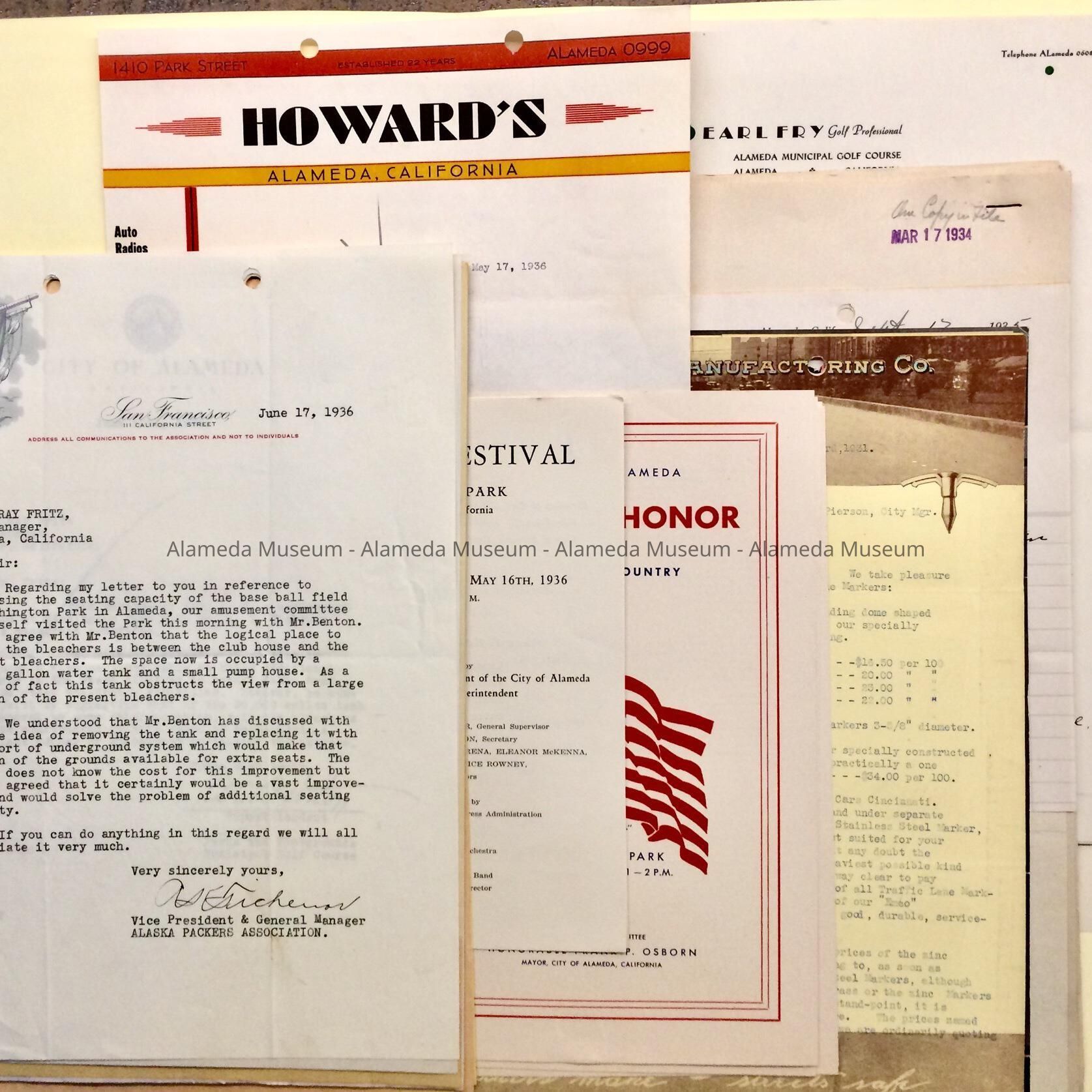 History of Object: Contents of a folder found in the attic of City Hall in the 1990s. This folder contains miscellaneous documents mostly relating to the Recreation and Parks: Bleachers for the baseball field at Washington Park, including a letter from Alaska Packers Vice President and General Manager Tichenor on Packers stationery, to B. Ray Fritz, City Manager (1936); Scouts wanting a municipal camp (1934); continuation of May Festivals (1933); Quote for city-paid lights at the various parks by, and on stationery of, Ansel’s Electric, 1401 Park Street (1931); Programs (3) for 1951 Flag Day; Program for 1936 Spring Festival; Note of appreciation for the 1936 Spring Festival from Howard’s, 1410 Park Street, to Mayor Roebke; quote from Edwards Manufacturing Co., Cincinnati, for a traffic lane markers to Neil B. Pierson, City Manager (1931), and invoice from Alameda Aluminum Foundry, 2021 Clement Ave., for same; quote for installing lights on tennis courts from Scott-Buttner, Oakland / S.F. (1931); quotes to A. G. Benton, Superintendent, for fountain repairs from Harry C. Rea, 2031 Buena Vista and Charles Smith, 1250 Park Street (1935); An 1934 list of Civic organizations compiled by City Historian’s office; a list of businesses and people employed by the Employment Bureay (1935); mostly monthly reports from Earl Fry at the golf course (1931); Advertisement for a "Walk-A-Way DERBY'' at the S.F. Bay Airdrome, sent from the City Employment Bureau to City Manager Bryant, asking if locals could be employed.