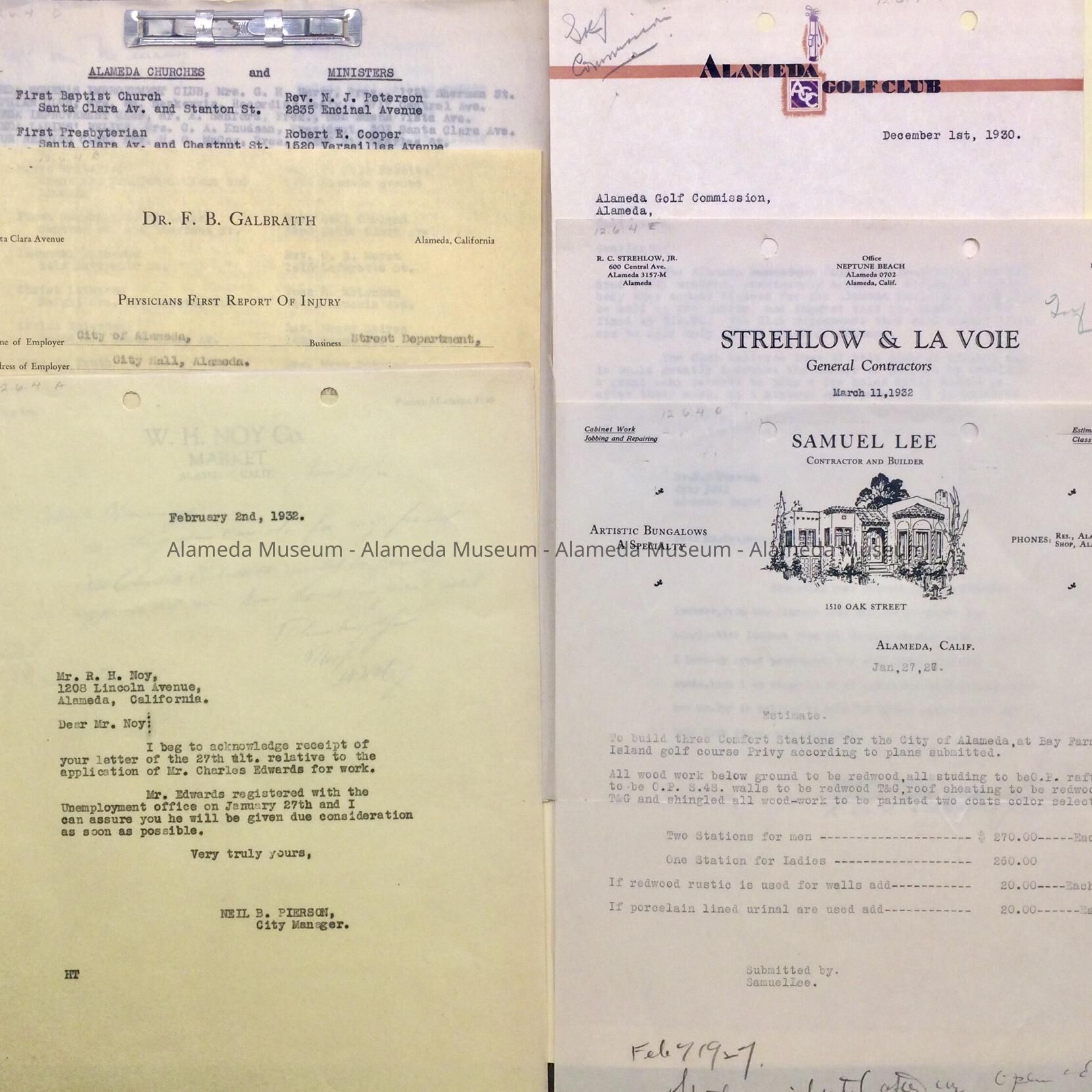 History of Object: A: Letter recommending Charles Edwards for work from Noy to Mayor Hemmings and reply from City Manager Pierson; B: job-related injury and treatment report (tetanus-shot) for Charles Kellberg, laborer; C: List of churches and ministers, and civic organizations contacts, with a 1932 letter regarding a committee for unemployment Relief signed by Mayor W. F. Muscovy [?]; D: quote for comfort station at Bay Farm Island golf course; E. letter of agreement for locker changes at the golf club; F. recommendation for sale of annual tickets to the golf course.
