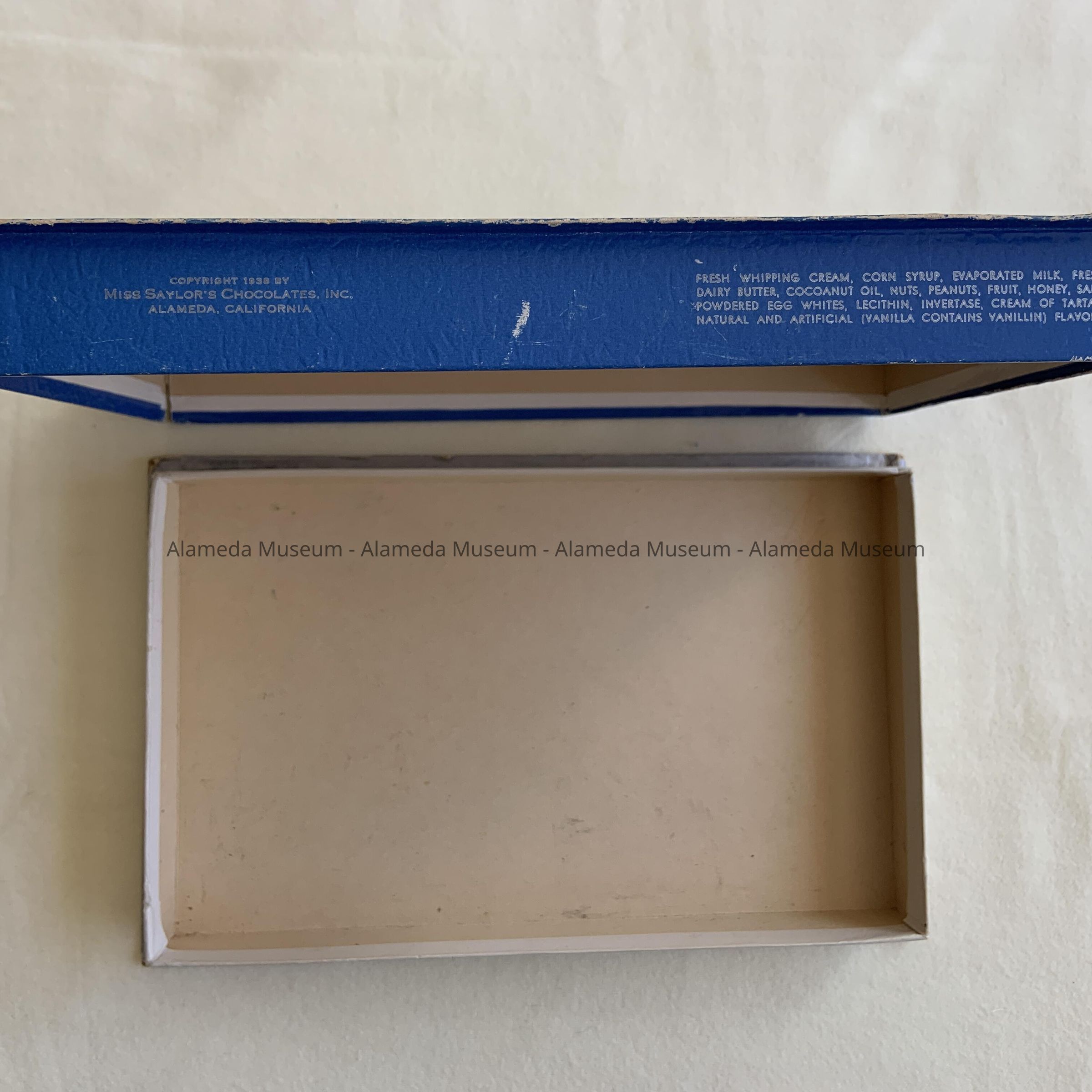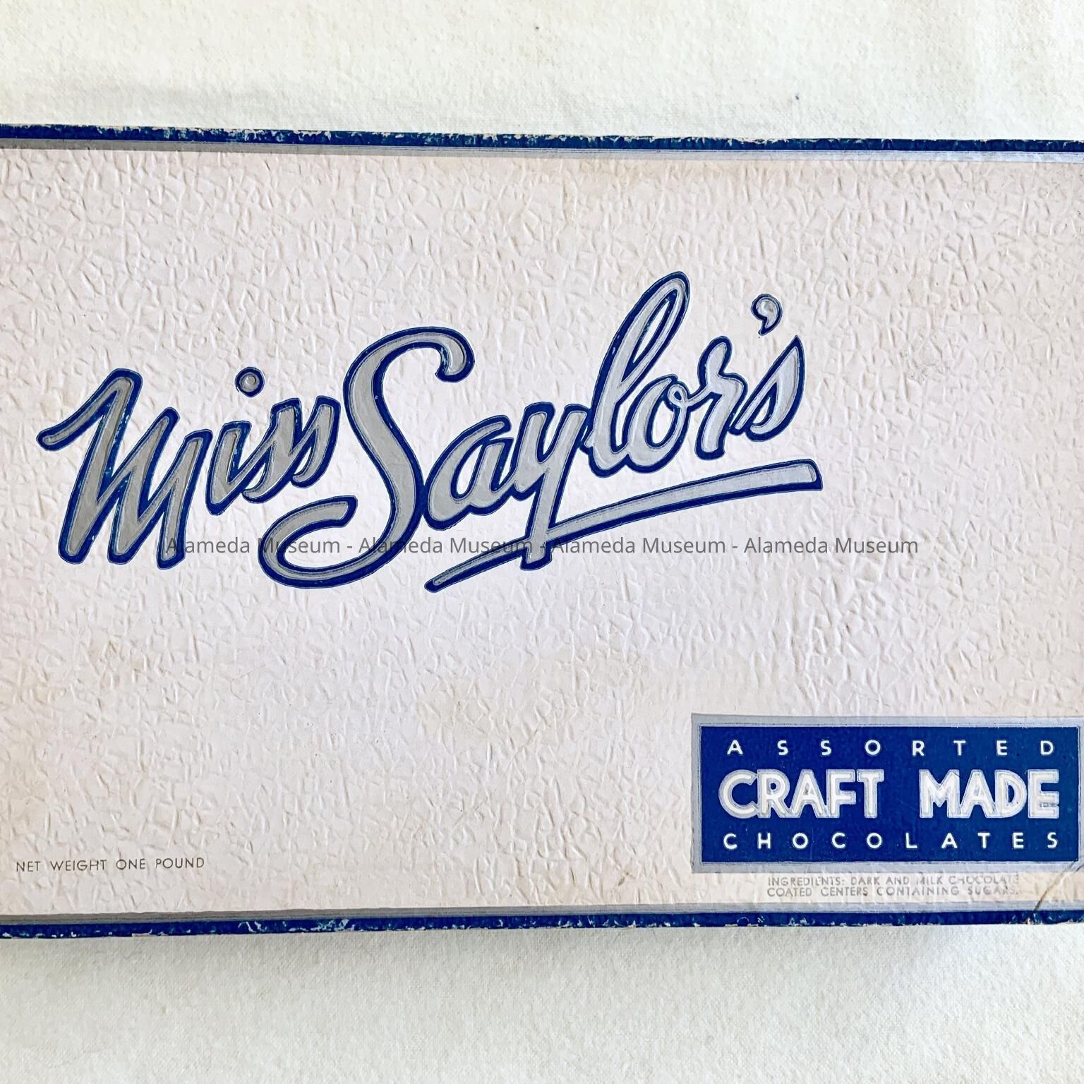 History of Object: A candy box of the Miss Saylor's Chocolate Inc., of Alameda that was founded and located on the SE corner of Park St. and Encinal Ave. (now gone).