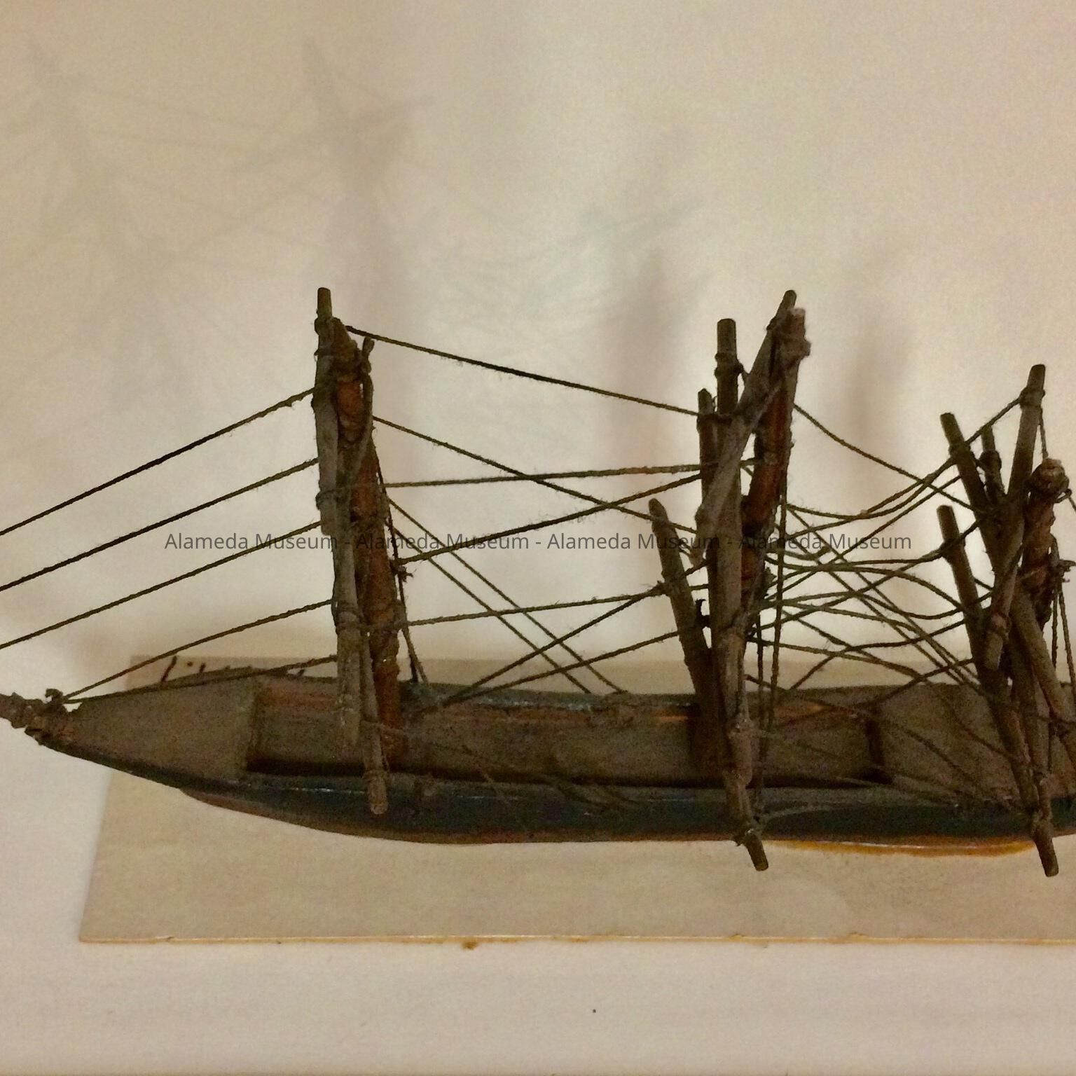 SAILING VESSEL MODEL OF THE "STAR OF ALASKA," MADE ON BOARD SHIP WHILE SAILING TO ALASKA. THE MODEL WAS ORIGINALLY PART OF MS PORTER'S MUSEUM COLLECTION, WHICH WAS HOUSED IN WASHINGTON SCHOOL. IT WAS GIVEN TO THE ALAMEDA HISTORICAL SOCIETY IN 1956 AND HERETOFORE NOT OFFICIALLY CATALOGED.
