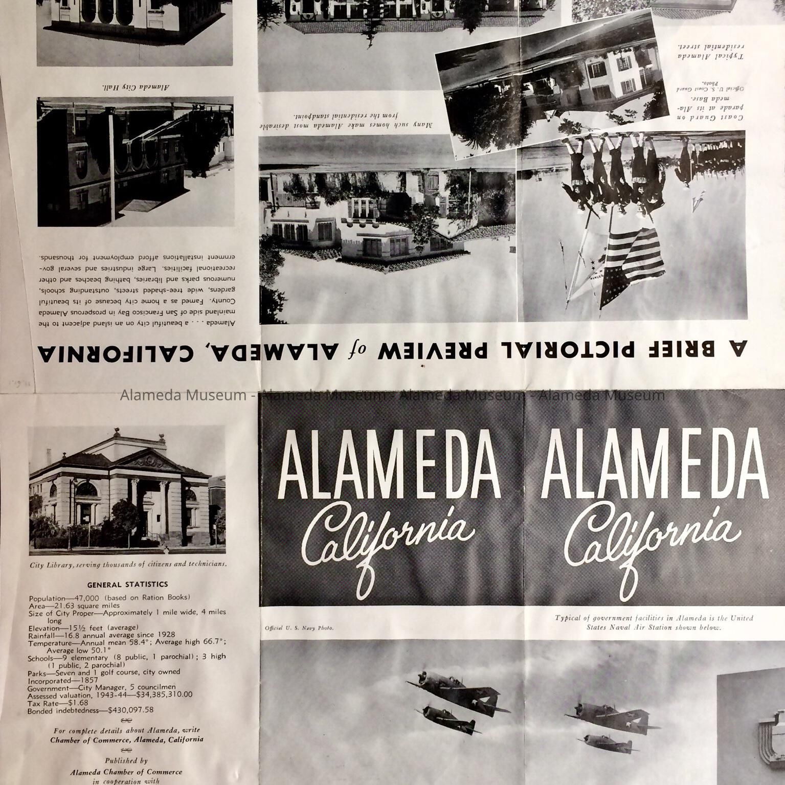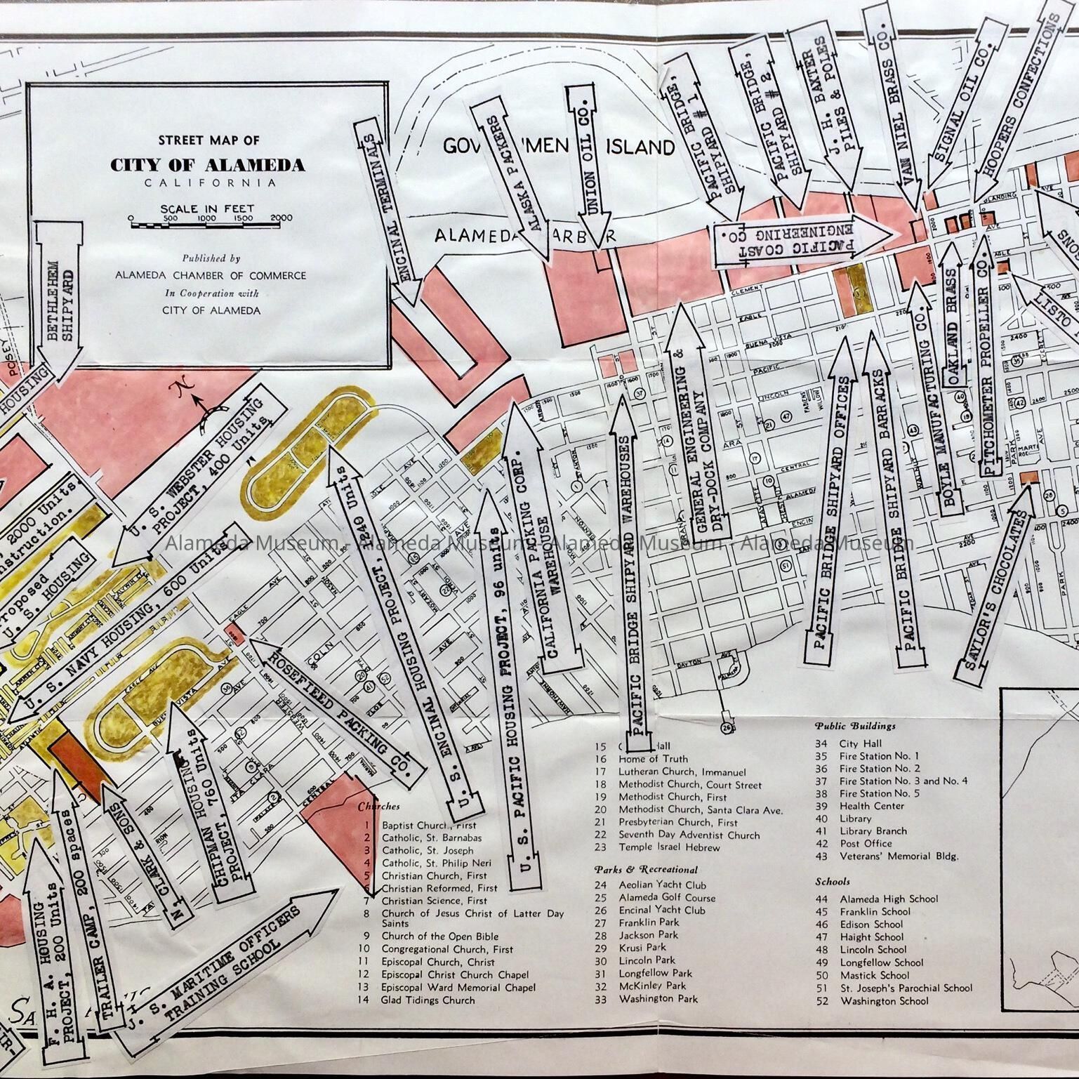Description: Undated folding ‘Street Map of City of Alameda, California, published by the Alameda Chamber of Commerce in Cooperation with City of Alameda’, with applied arrow-shaped labels and highlighted in pink, yellow, and what is now brownish and may have been a different color originally, pointing to military housing projects. On the reverse ‘A Brief Pictorial Preview of Alameda, California’, illustrated with black-and-white photos of scenes from Alameda, with some of them reflecting military activity. Under statistics is listed the assessed valuation of 1943-1944.