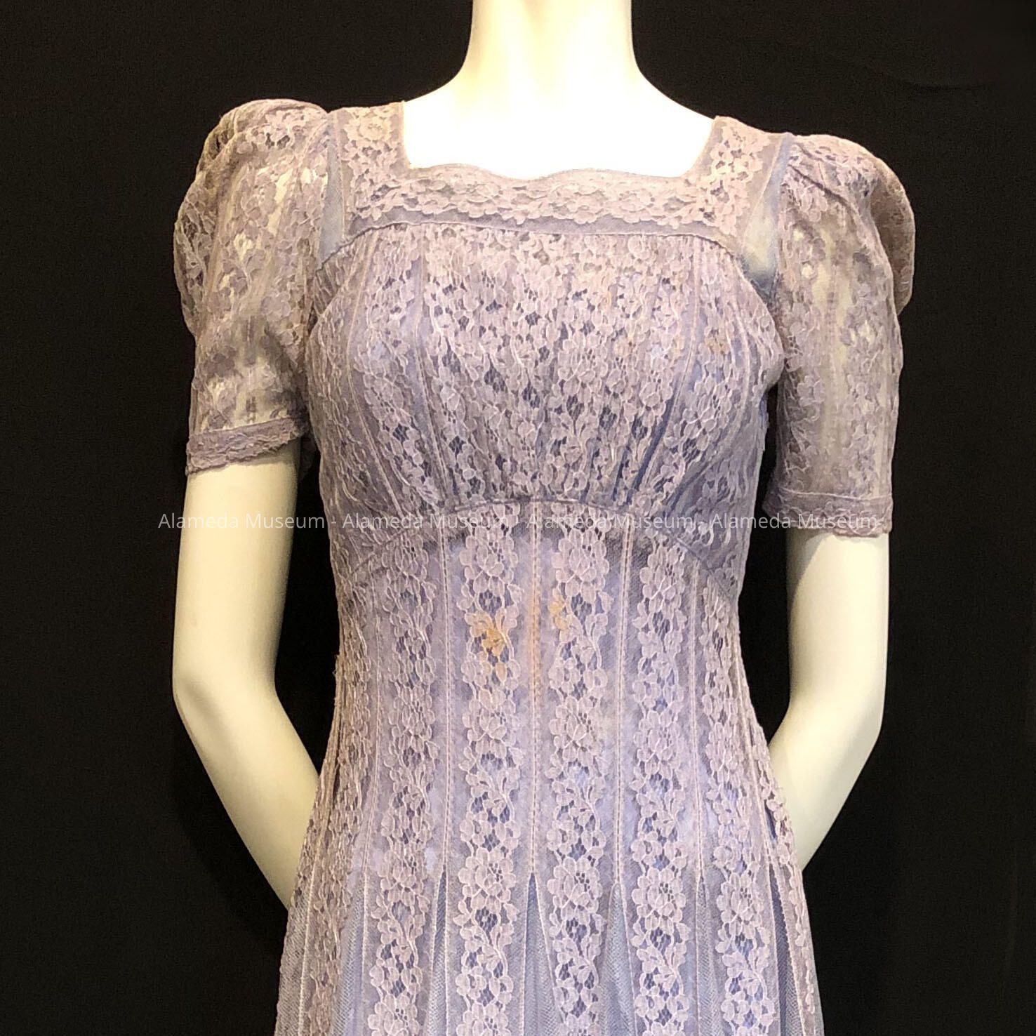 Description: Moline net lavender cotton lace dress has a square neck, high waist, and short sleeves, and a long, flared skirt. Matching rayon petticoat.