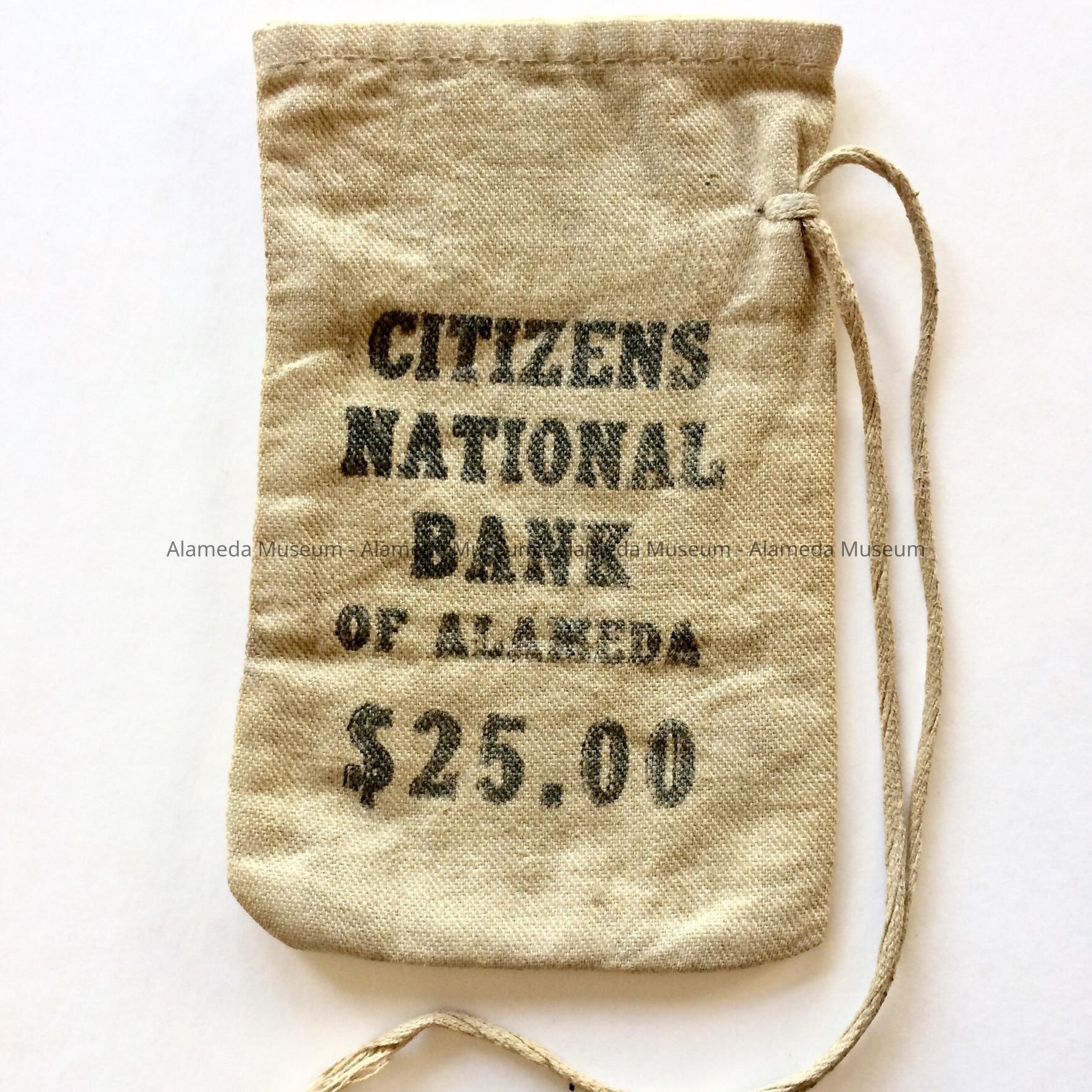 MONEY BAG FROM THE CITIZENS NATIONAL BANK OF ALAMEDA, PARK STREET, LATER ABSORBED BY THE BANK OF AMERICA. MONEY BAG WAS GIVEN TO THE ALAMEDA HISTORICAL SOCIETY IN 1971 AND NOT OFFICIALLY CATALOGED AT THAT TIME.