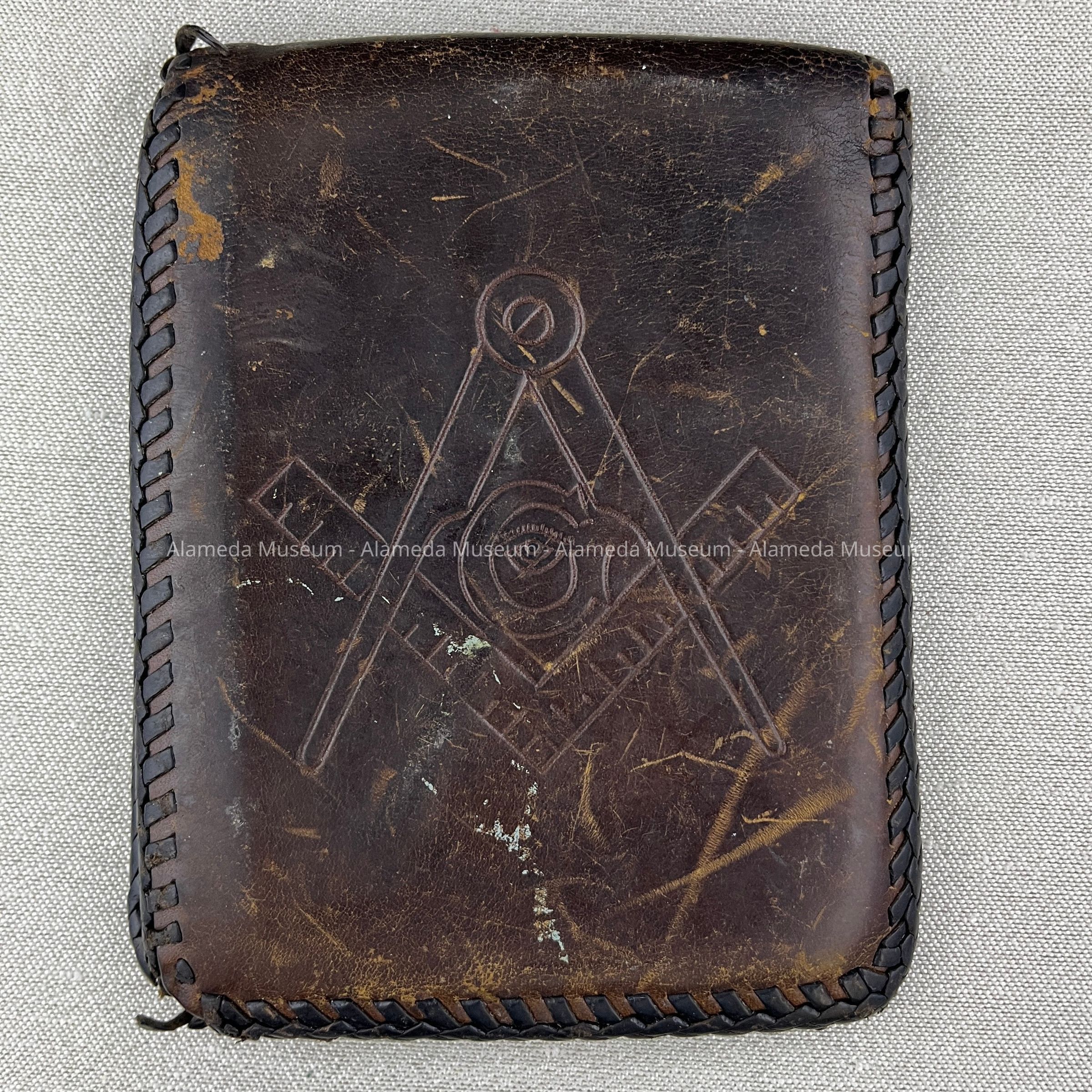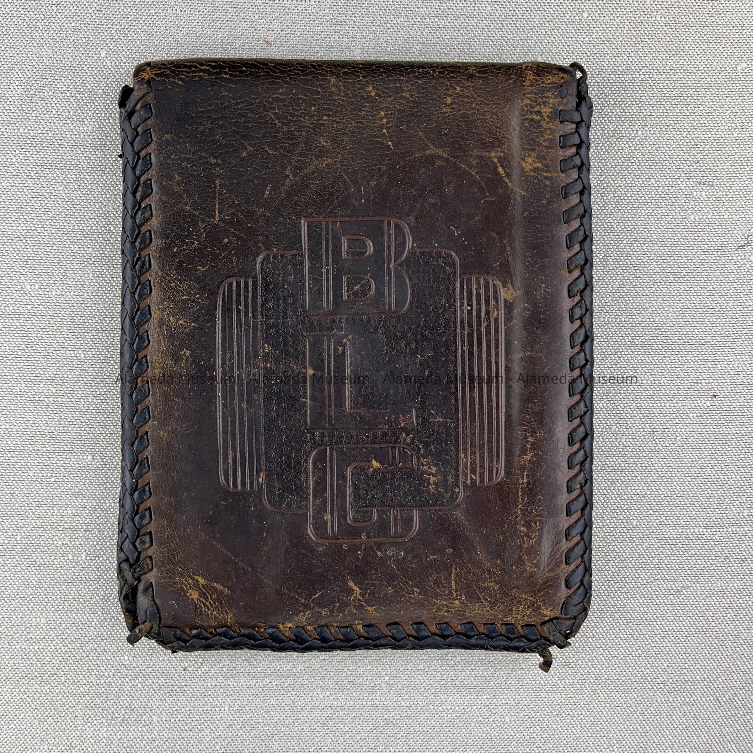 Description: Brown leather wallet, with four inside compartments, and incised on one side, monogram ‘BLC’ in art-deco design, and on the other side, masonic symbols. Sides are decoratively sewn together with a leather strip.
