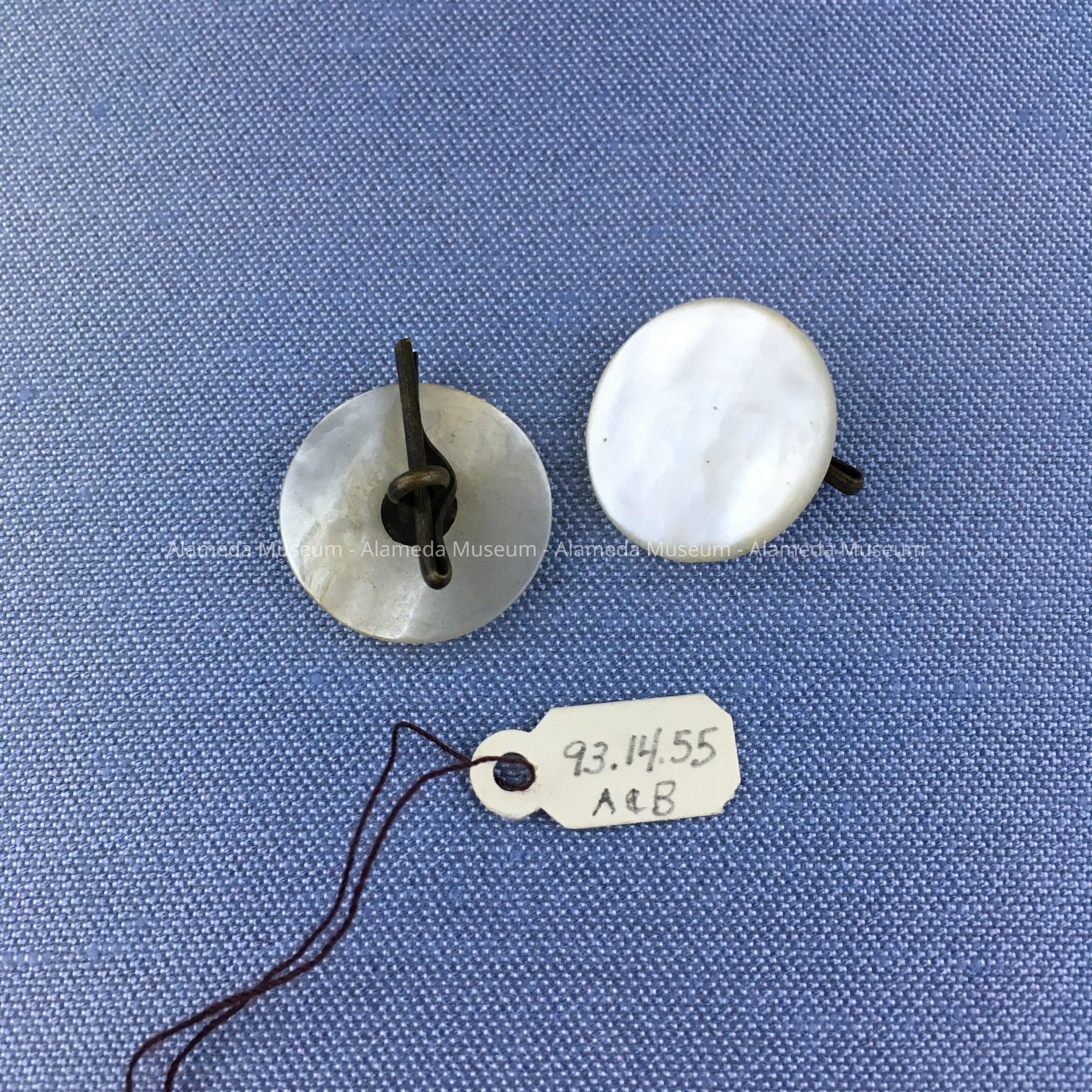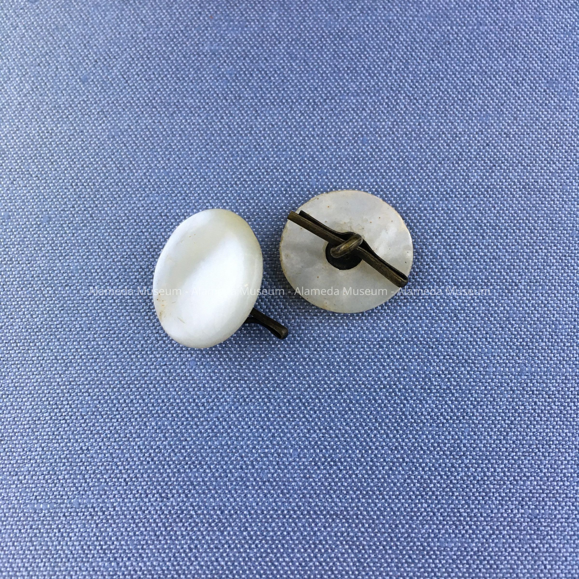 Mother-of-pearl cufflinks or buttons with brass shanks and clips.
