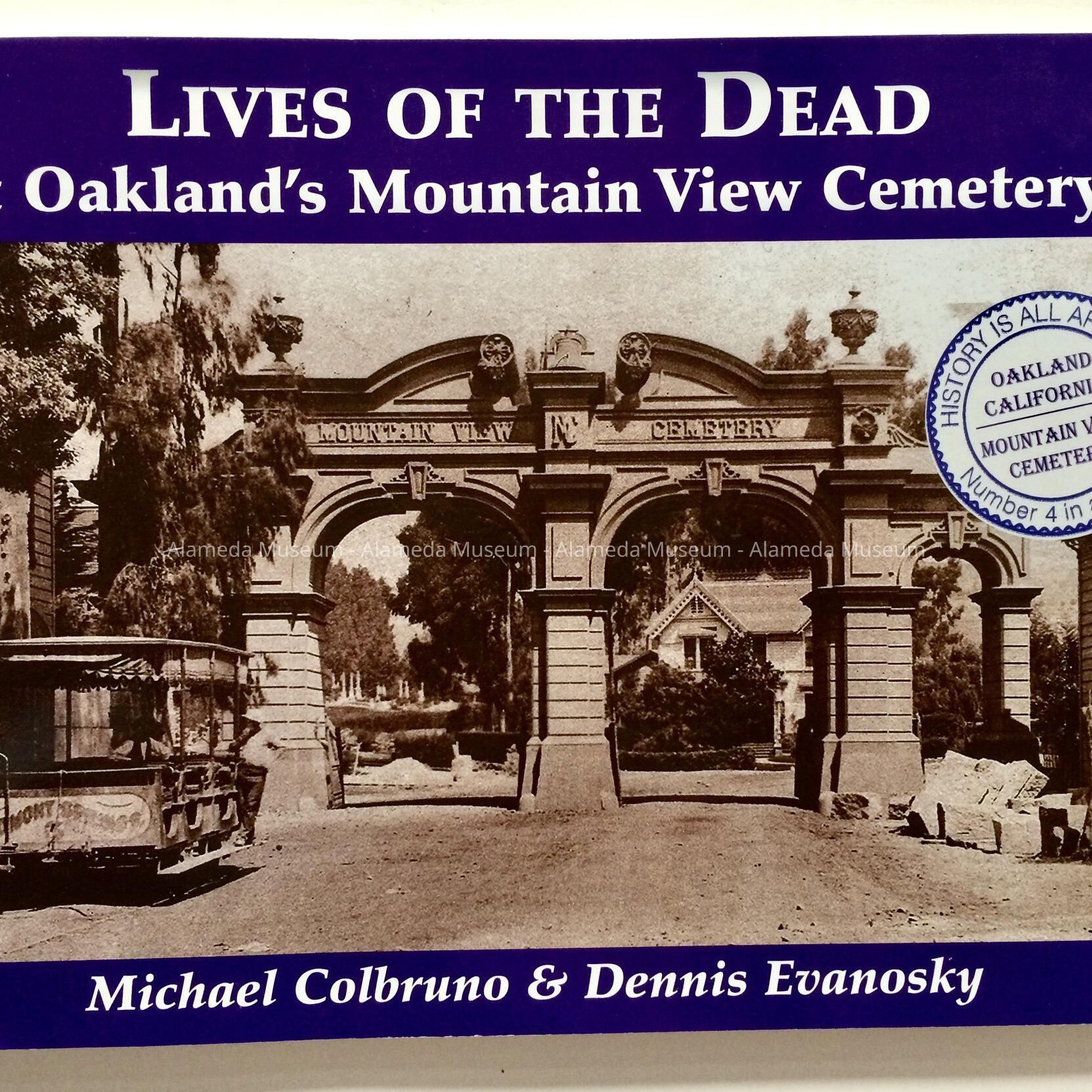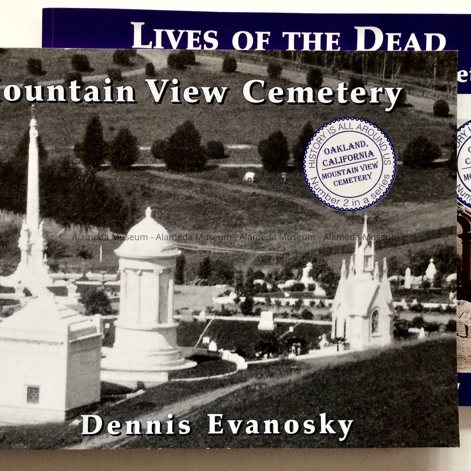 Description: softbound books with glossy card stock paper cover, both with a printed circular seal stating 'Mountain View Cemetery'. A: Number 2, 2007, title 'Mountain View Cemetery, author Dennis Evanosky. B: Number 4, 2015, title 'Lives of The Dead at Oakland's Mountain View Cemetery', by Micahel Colbruno & Dennis Evanosky. Published by Stellar Media Group, Inc., 3215 Encinal Ave, Alameda.