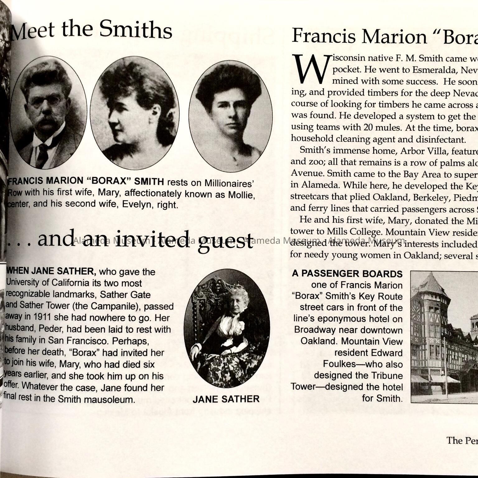 History of Object: two books from a series about historical figures who have a monument at the Mountain View Cemetery. Each has photos and a history. Several late Alameda residents are featured: in A: p 19: Francis "Borax" Smith; and the GAR plot (p 81); in B: p 36, the Haight family; p 50, Edgar Cohen; p 64, Albert and Emma Cohen; p 68: Henry and Bertha Meyers; also describes a plaque commemorating Aughingbaugh, co-founder of Alameda.