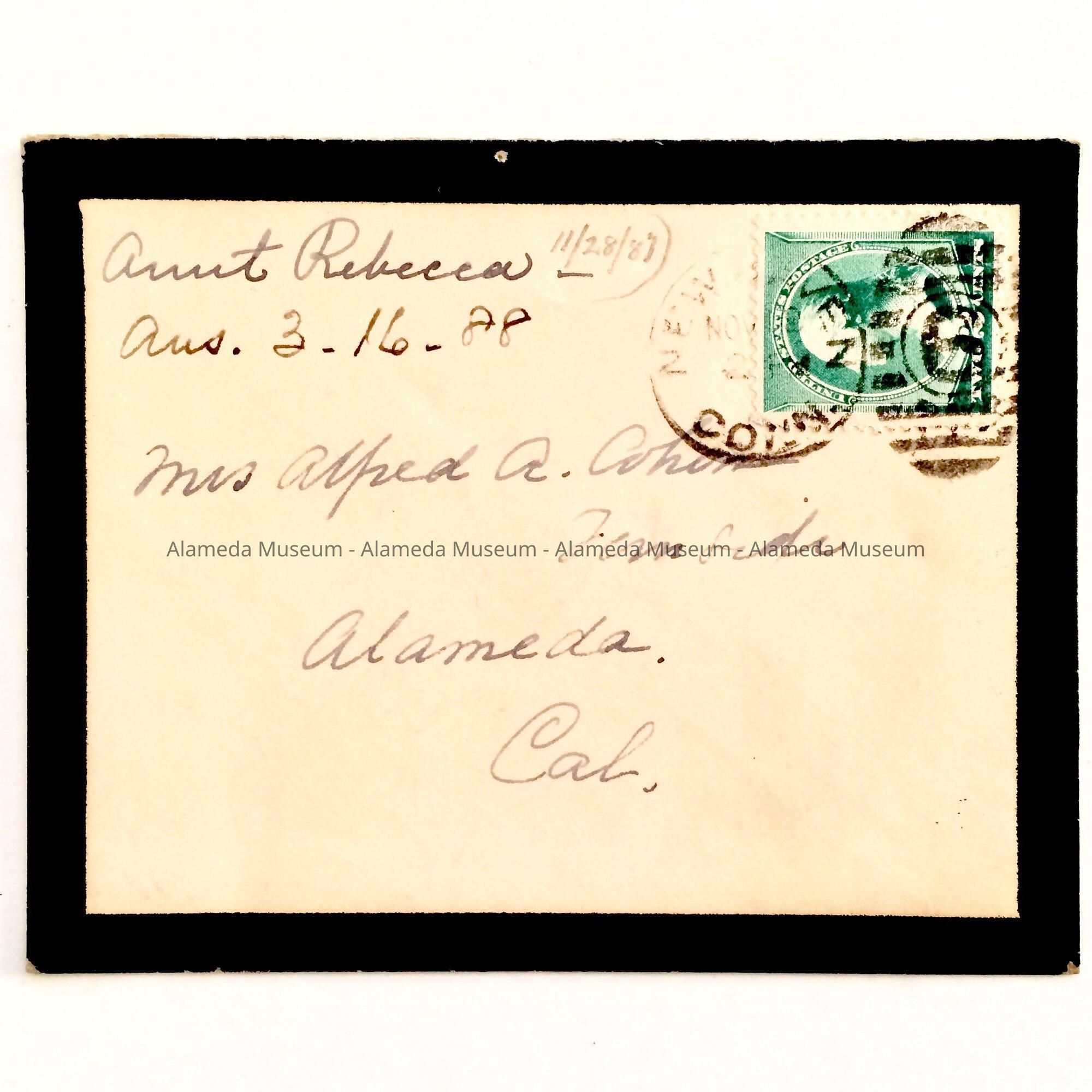 Return address states Aunt Rebecca. Envelope believed to have originally contained a sympathy card or letter concerning the death of Mrs. Cohen's husband, A.A. Cohen who died in 1887. Mr. Cohen was a prominent attorney for the Southern Pacific and owner of a large estate in Alameda known as Fernside.