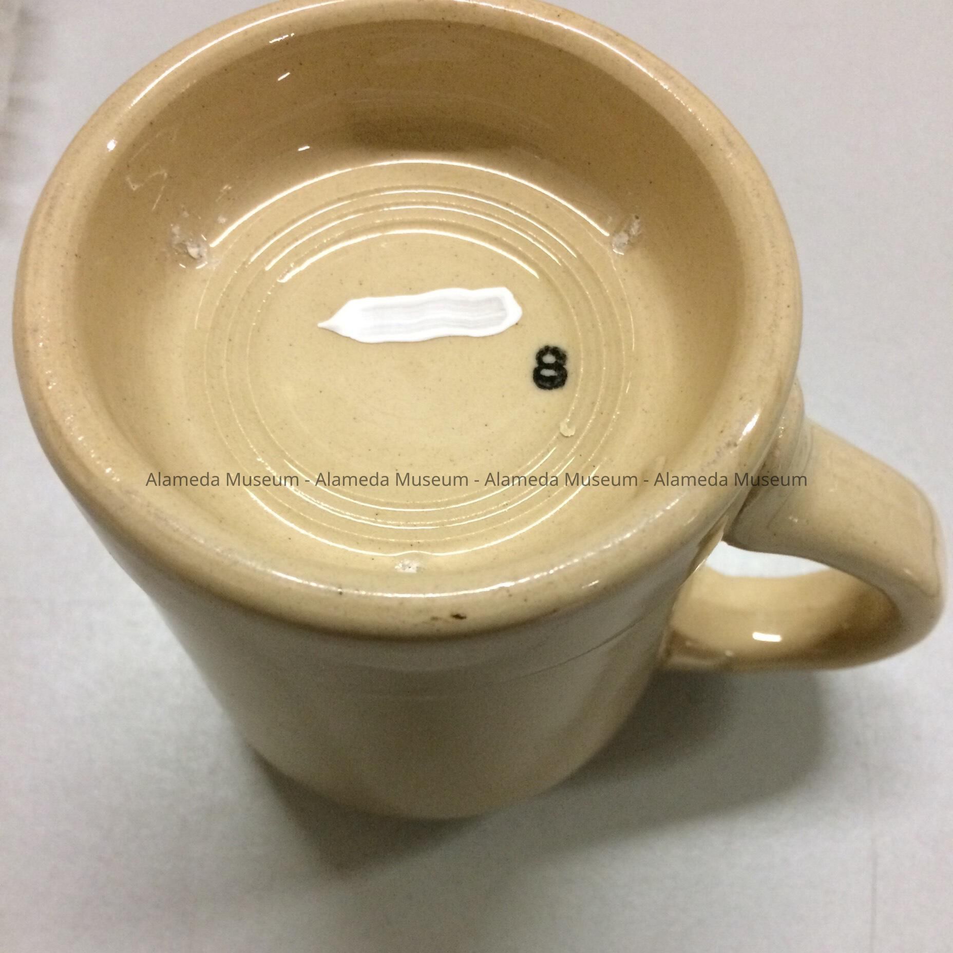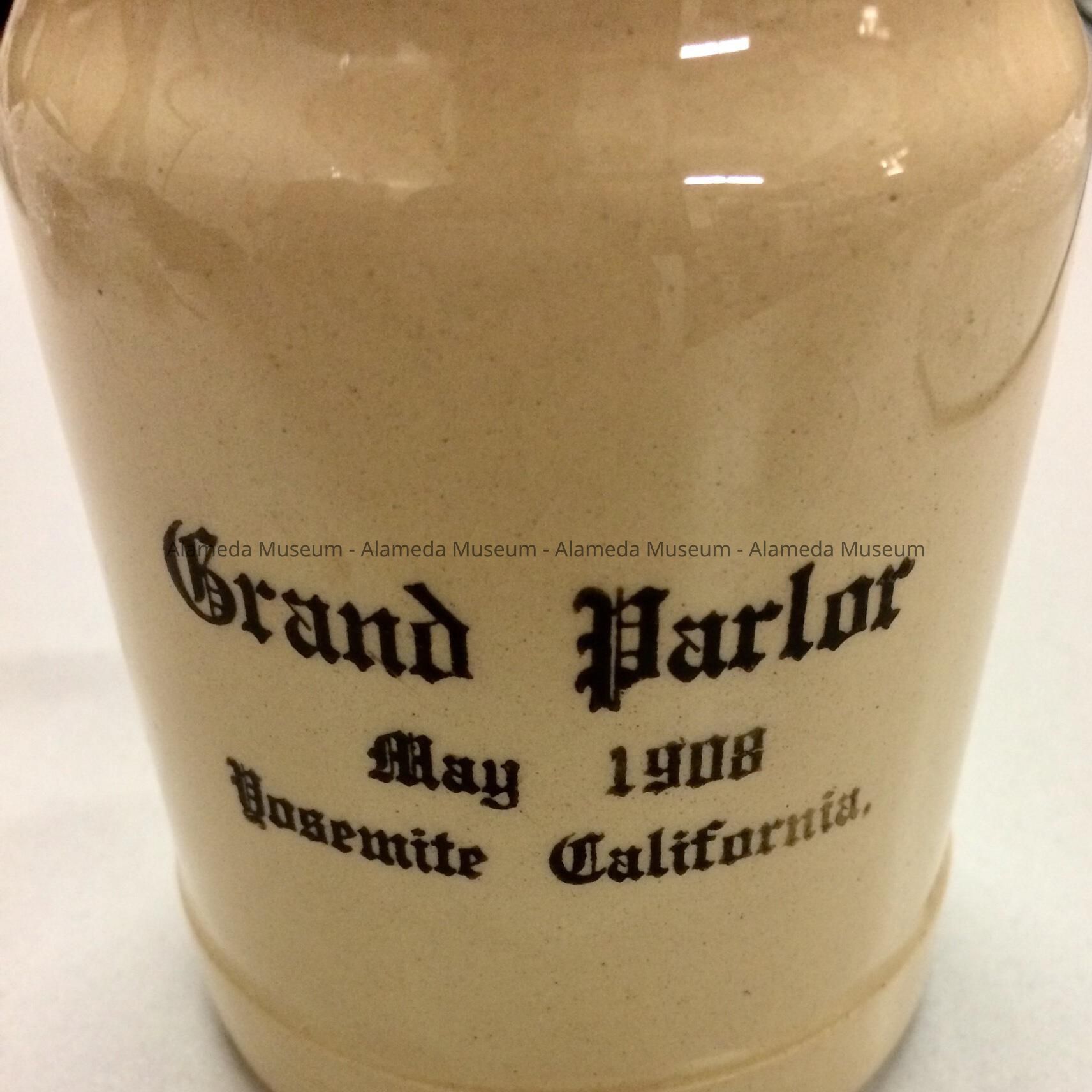 Description: glazed one ear mug, light tan outside, white inside. Marked ‘8’ in black under the glaze on the bottom, caption “Grand Parlor, May 1908, Yosemite California” in black gothic letters on front.