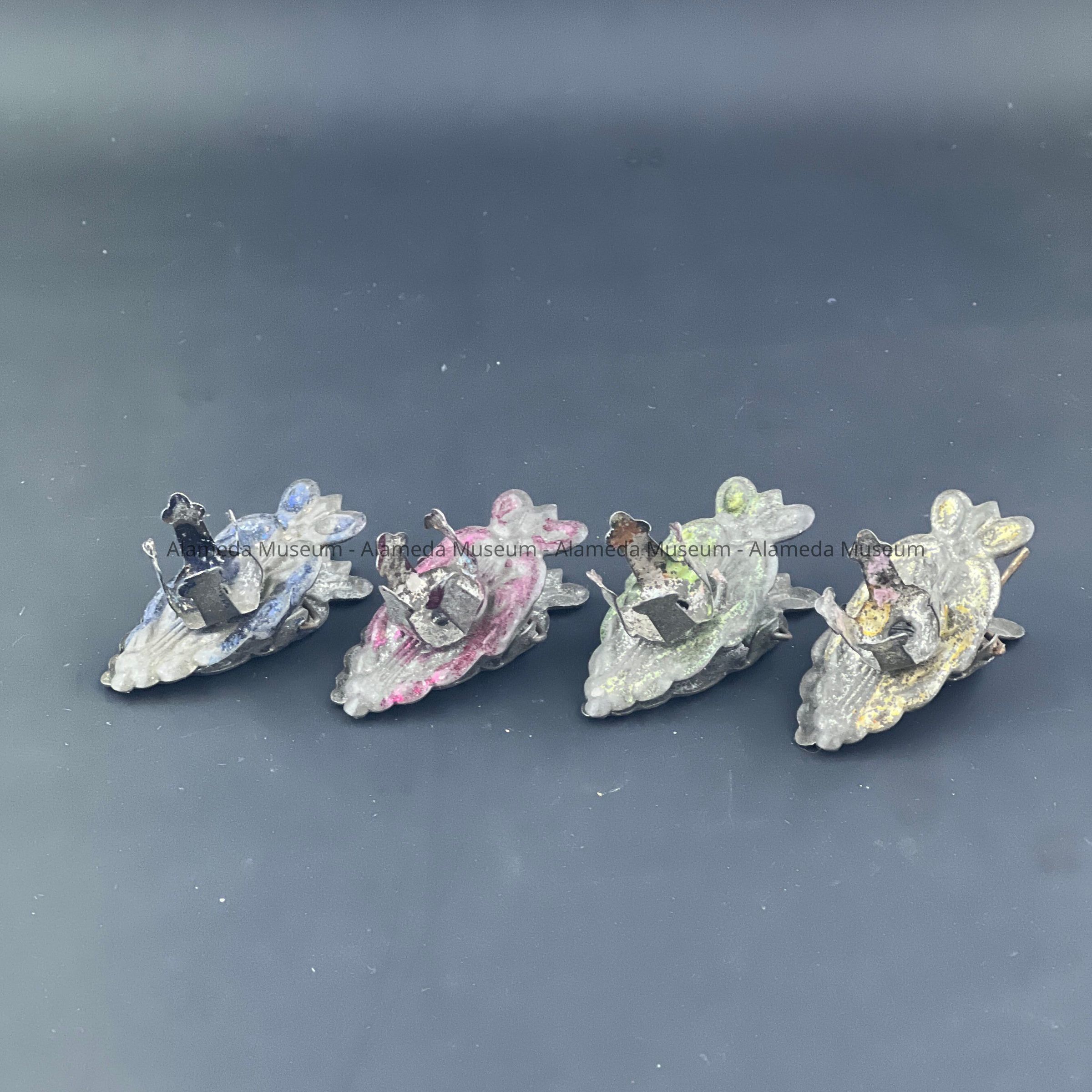 Description: These candle holders have either a blue, green, pink or yellow finish onto of the design relief. Using a coil hinge, these candle holders still have the remnants of candles that were used in them on a Christmas tree or other holiday decoration.
