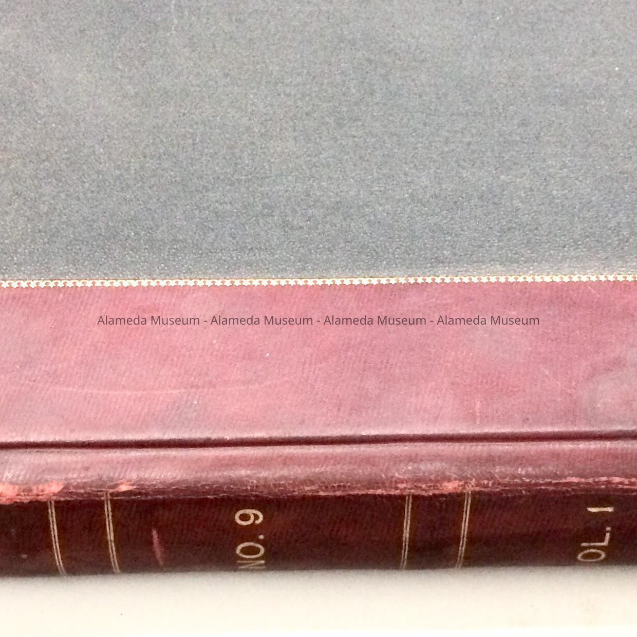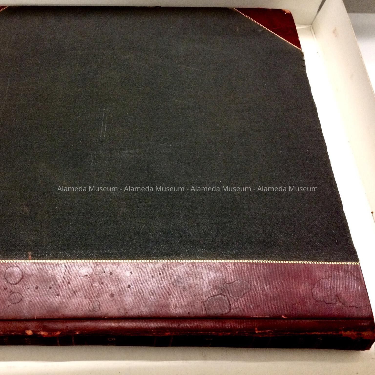 Description: Hardbound book with cover of black colored buckram trimmed in red leather and accentuated with gold. Spine caption "Municipal Bonds, No. 9, Vol. 1, City of Alameda."
