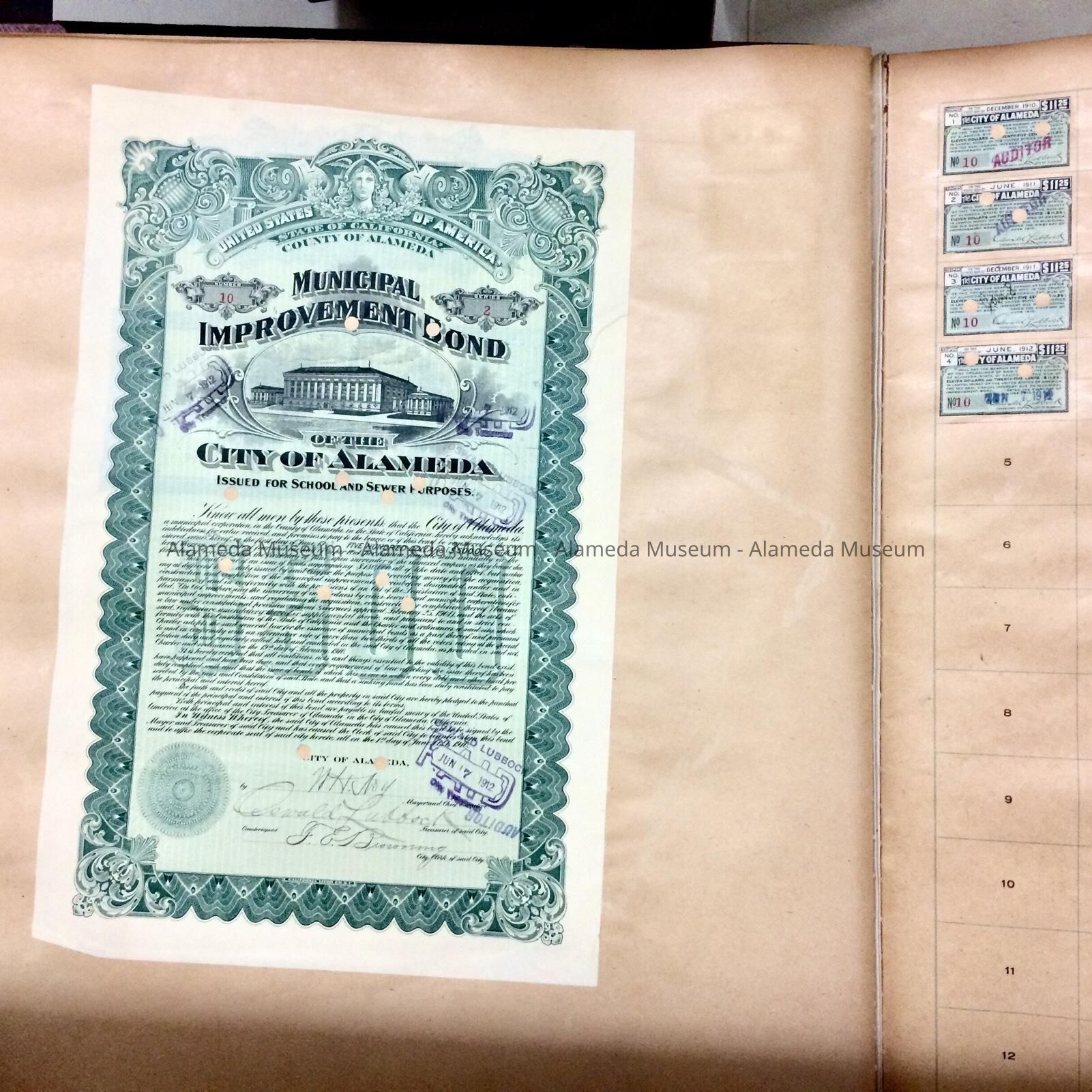 History of Object: Ledger containing printed bonds and coupons issued for city improvements.