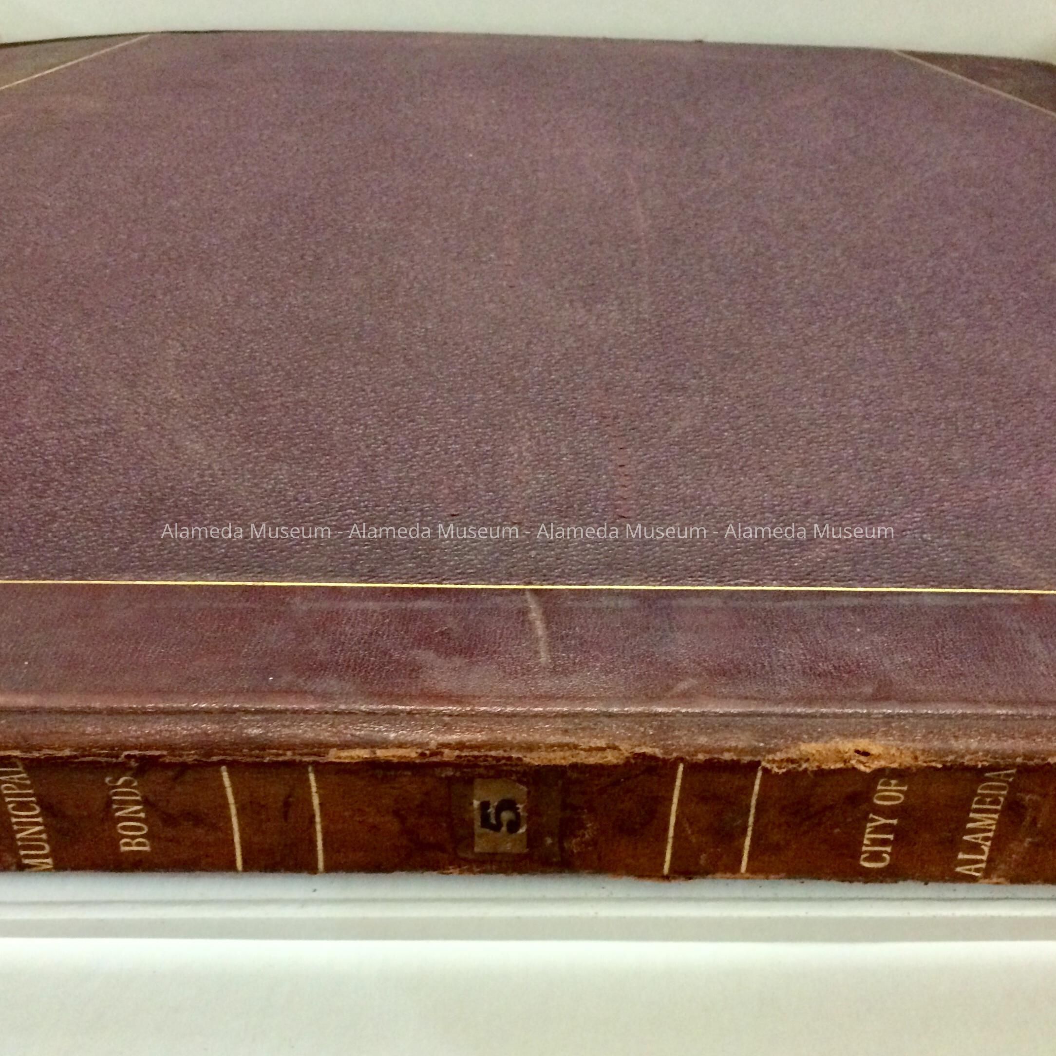 Description: hardbound book with cover of burgundy buckram and accentuated with gold. Spine caption: Municipal bonds, Vol. 5, City of Alameda". Contents are printed bonds and coupons.