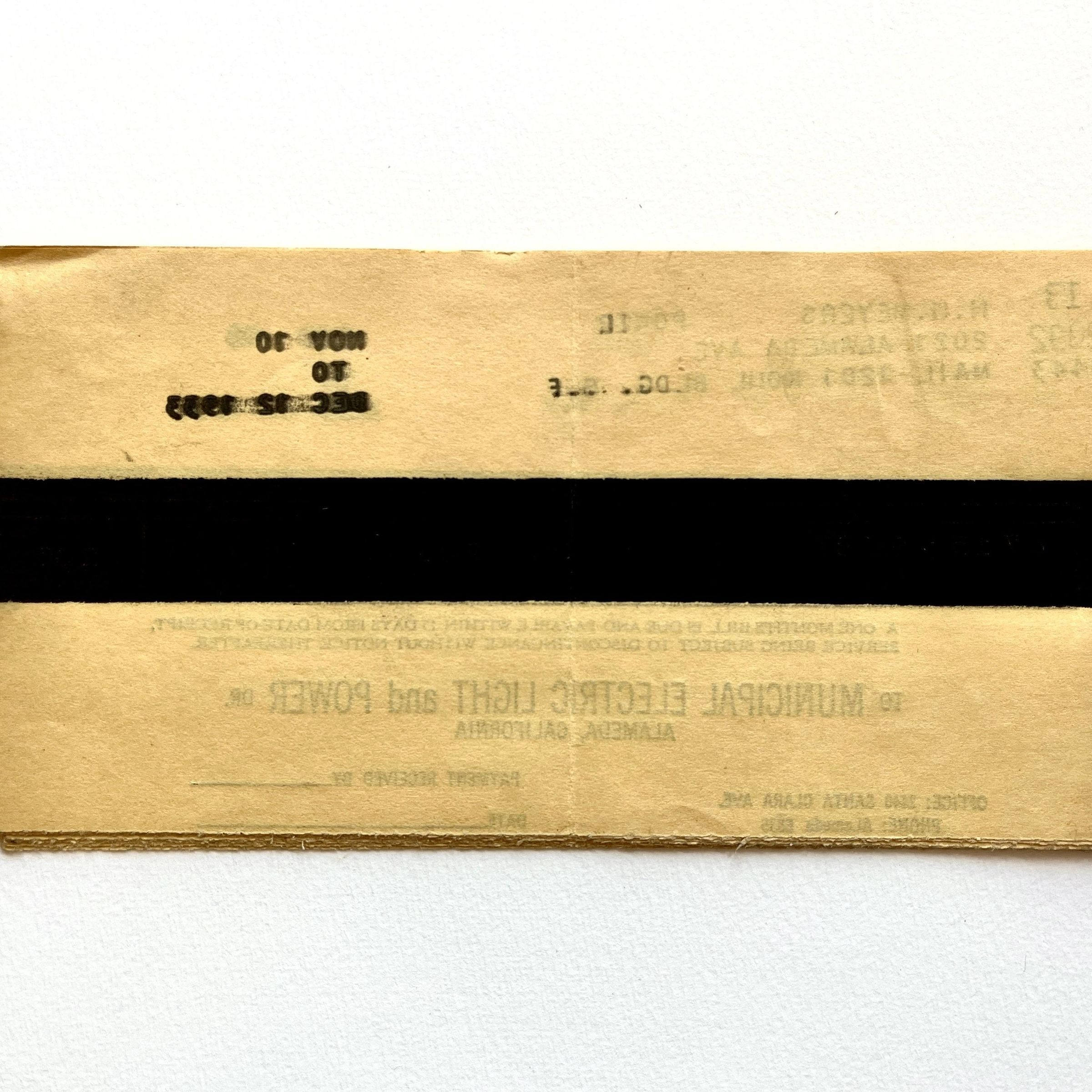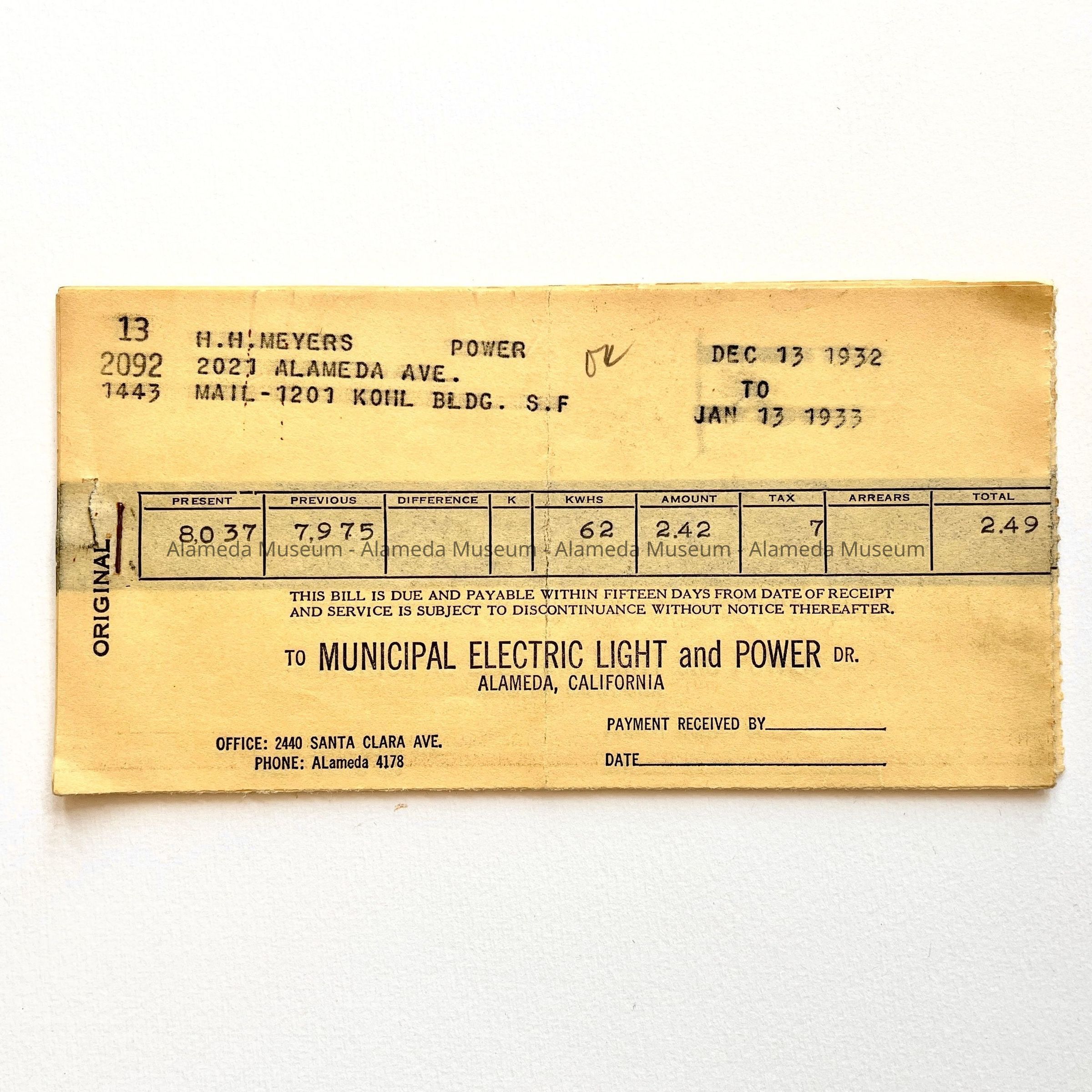 BILLS ADDRESSED TO HENRY H MEYERS, 2021 ALAMEDA AVENUE, FOR POWER PROVIDED BY THE MUNICIPAL ELECTRIC LIGHT PLANT, ALAMEDA.
