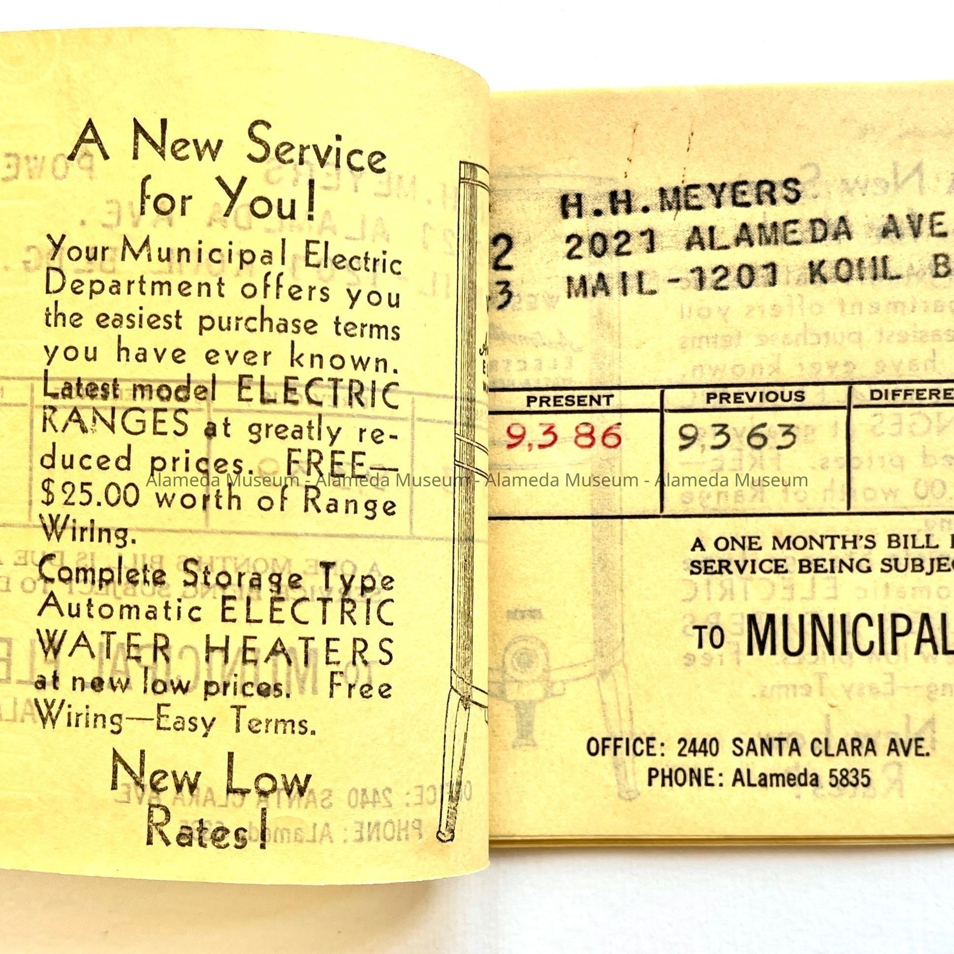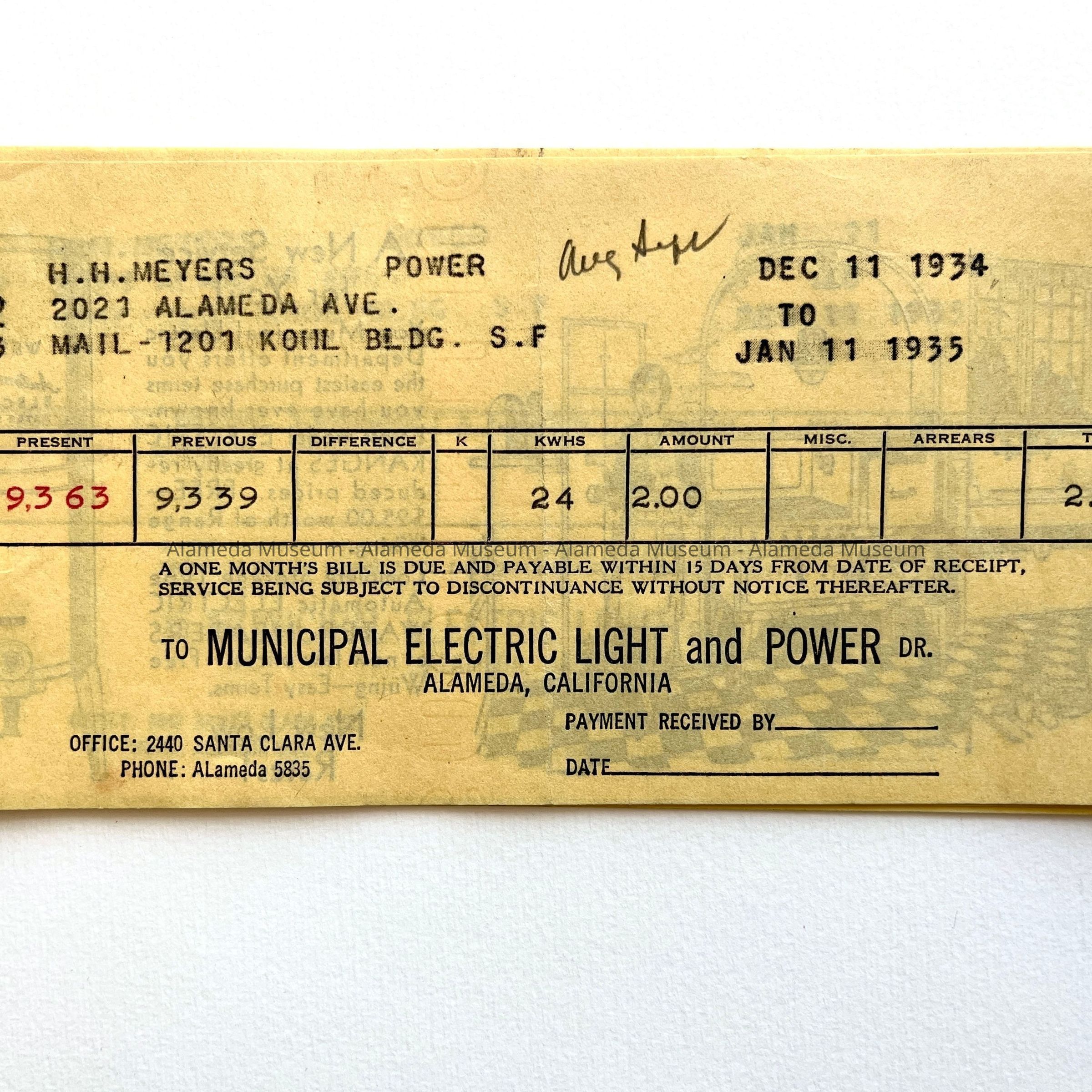 BILLS ADDRESSED TO HENRY H MEYERS, 2021 ALAMEDA AVENUE, ALAMEDA, FOR POWER PROVIDED BY THE MUNICIPAL ELECTRIC LIGHT PLANT, ALAMEDA.