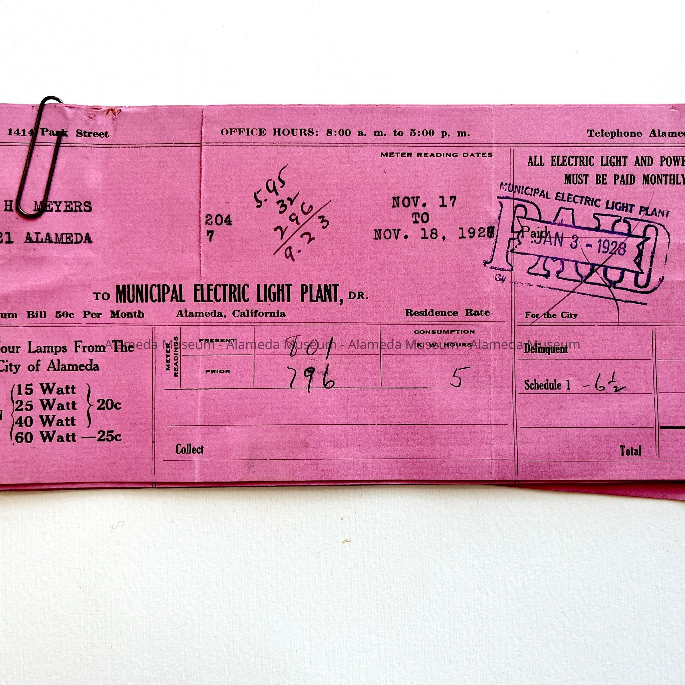 BILLS, PRINTED ON PINK-COLORED PAPER, WITH BOLD-PRINTED CAPTION, "MUNICIPAL ELECTRIC LIGHT PLANT."
