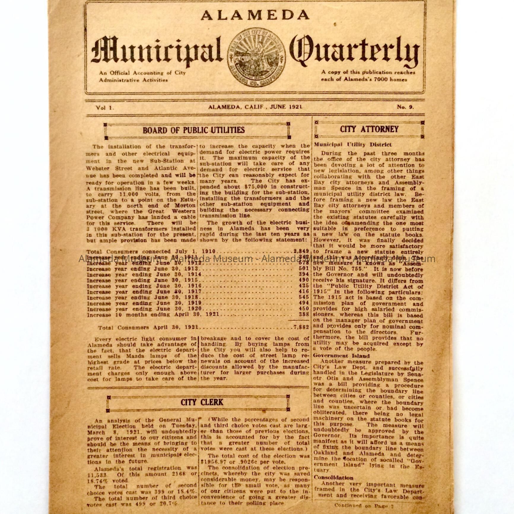 History: Publication entitled Alameda Municipal Quarterly for June 1921. Contents concern various departments of the City such as Health, Fire, etc.