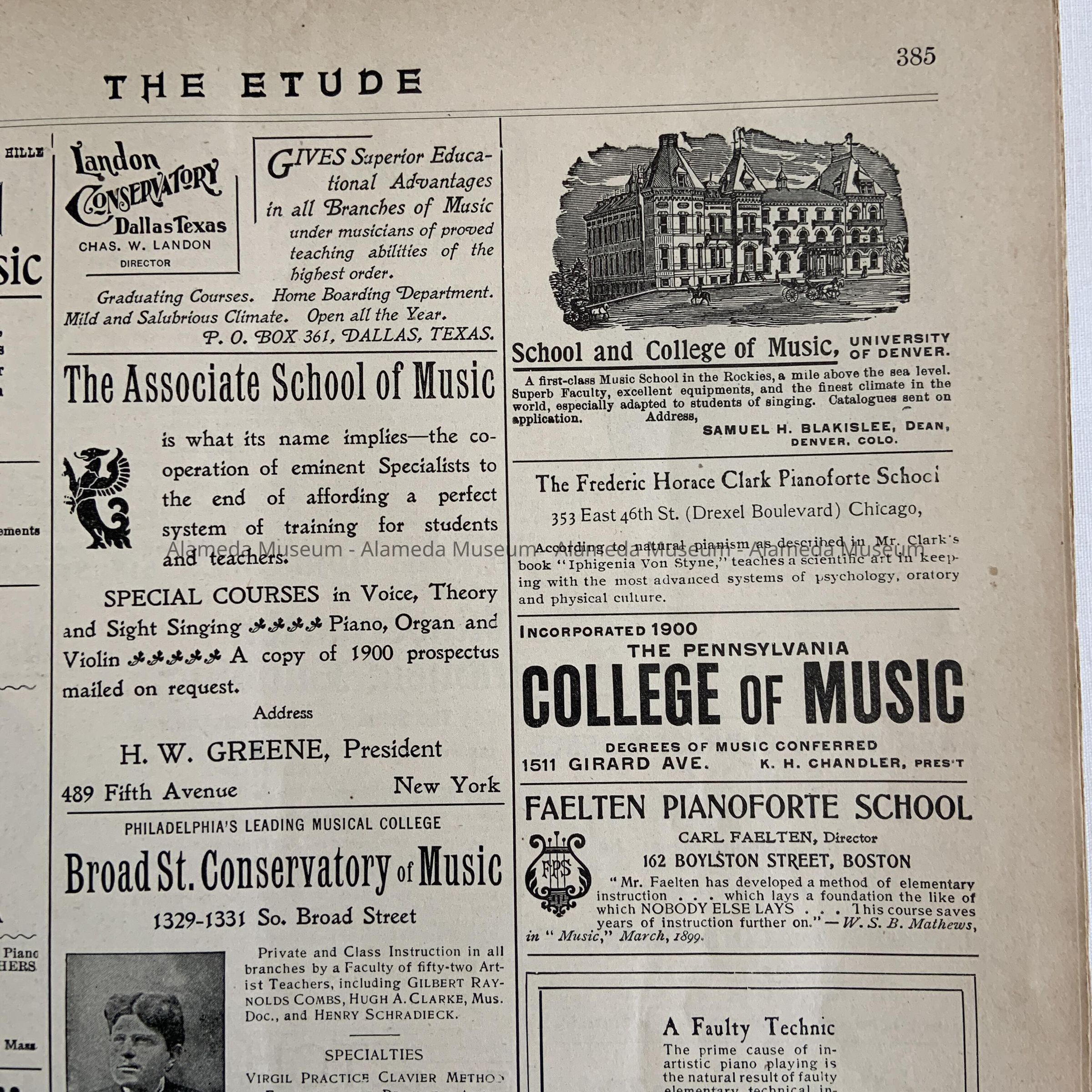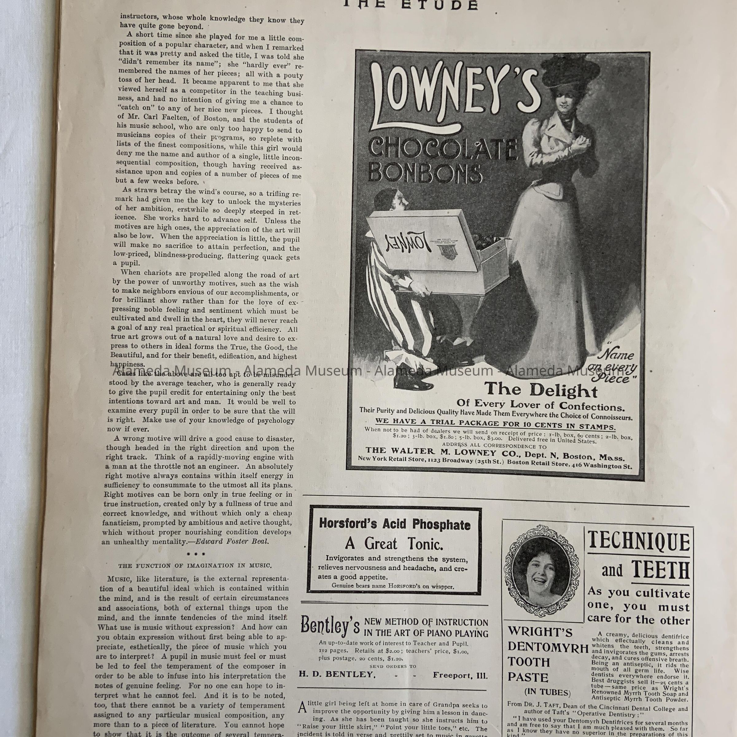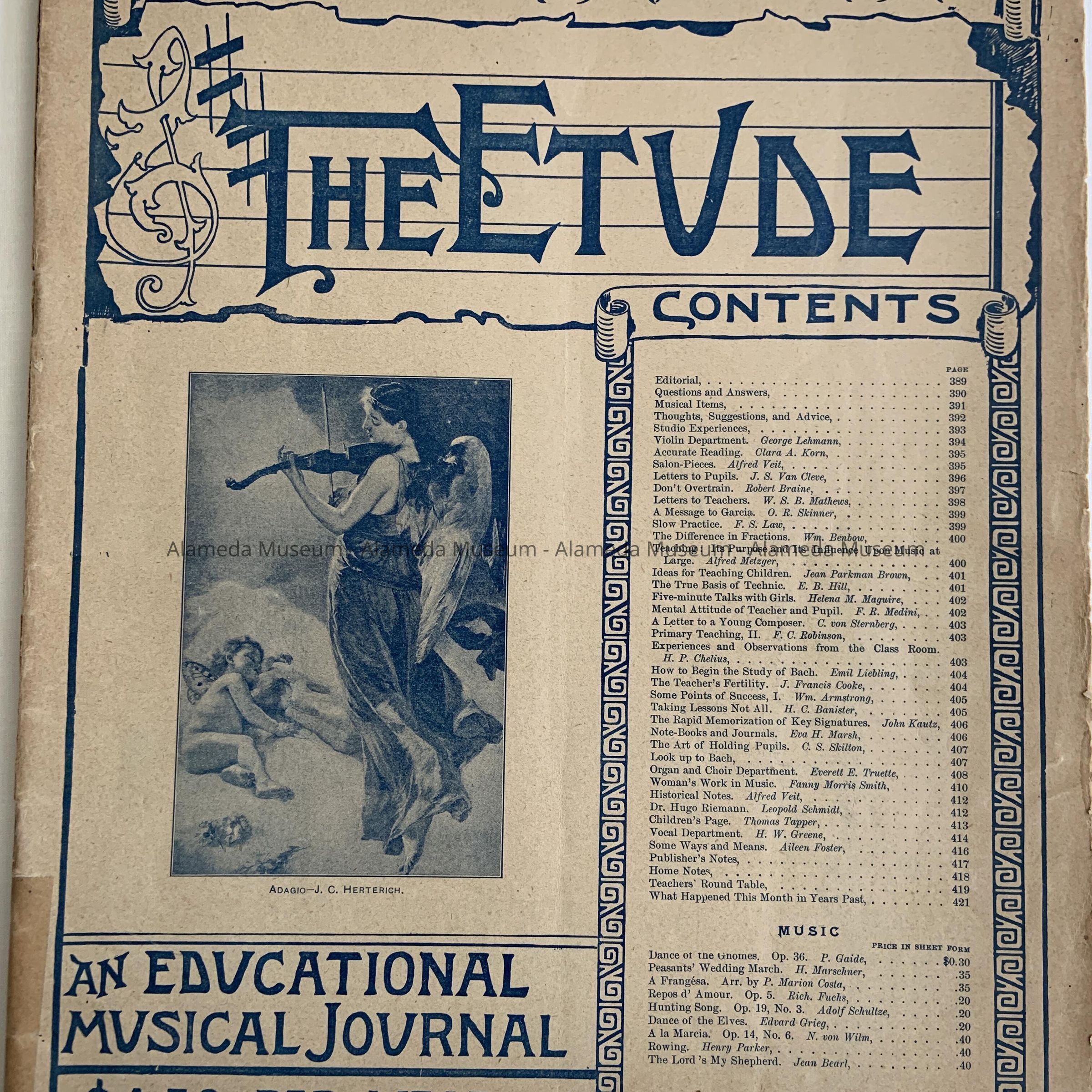 History of Object: The Etude musical journal, published by Theo. Presser, Philada, Pa. On page 420 is an advertisement for the Alameda Music Company, Alameda, Cal., and the musical composition of C. H. McCurrie, an Alameda resident and composer of childrens' songs.