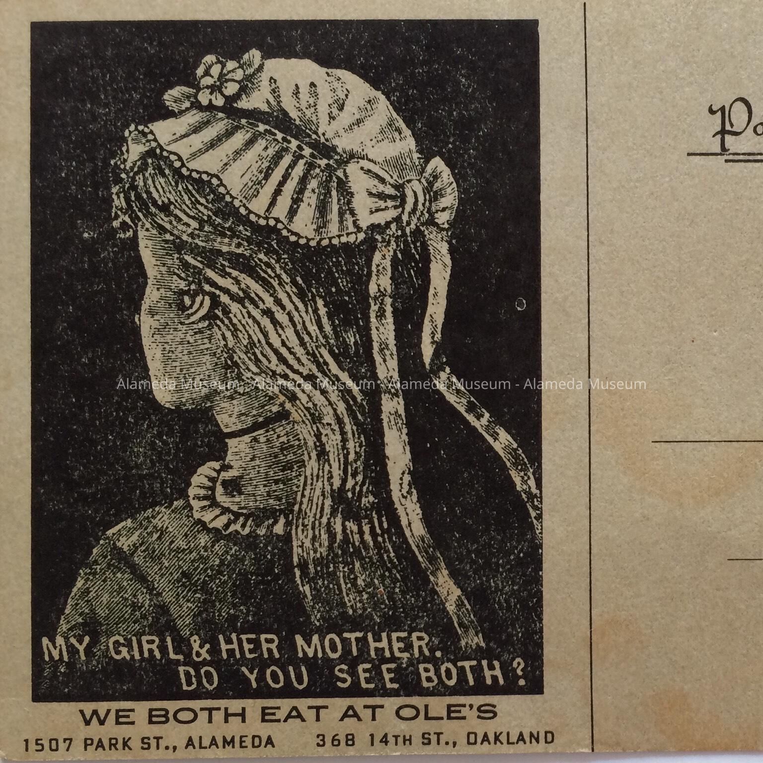 A POSTCARD DEPICTING A MYSTERY PICTURE, WITH CAPTION, "MY GIRL AND HER MOTHER. DO YOU SEE BOTH ?" LETTERING IS IN BLACK-COLORED TYPE ON LIGHT GREY-COLORED BACKGROUND. THE POST CARD ADVERTISES OLE'S AT 1507 PARK STREET, ALAMEDA.