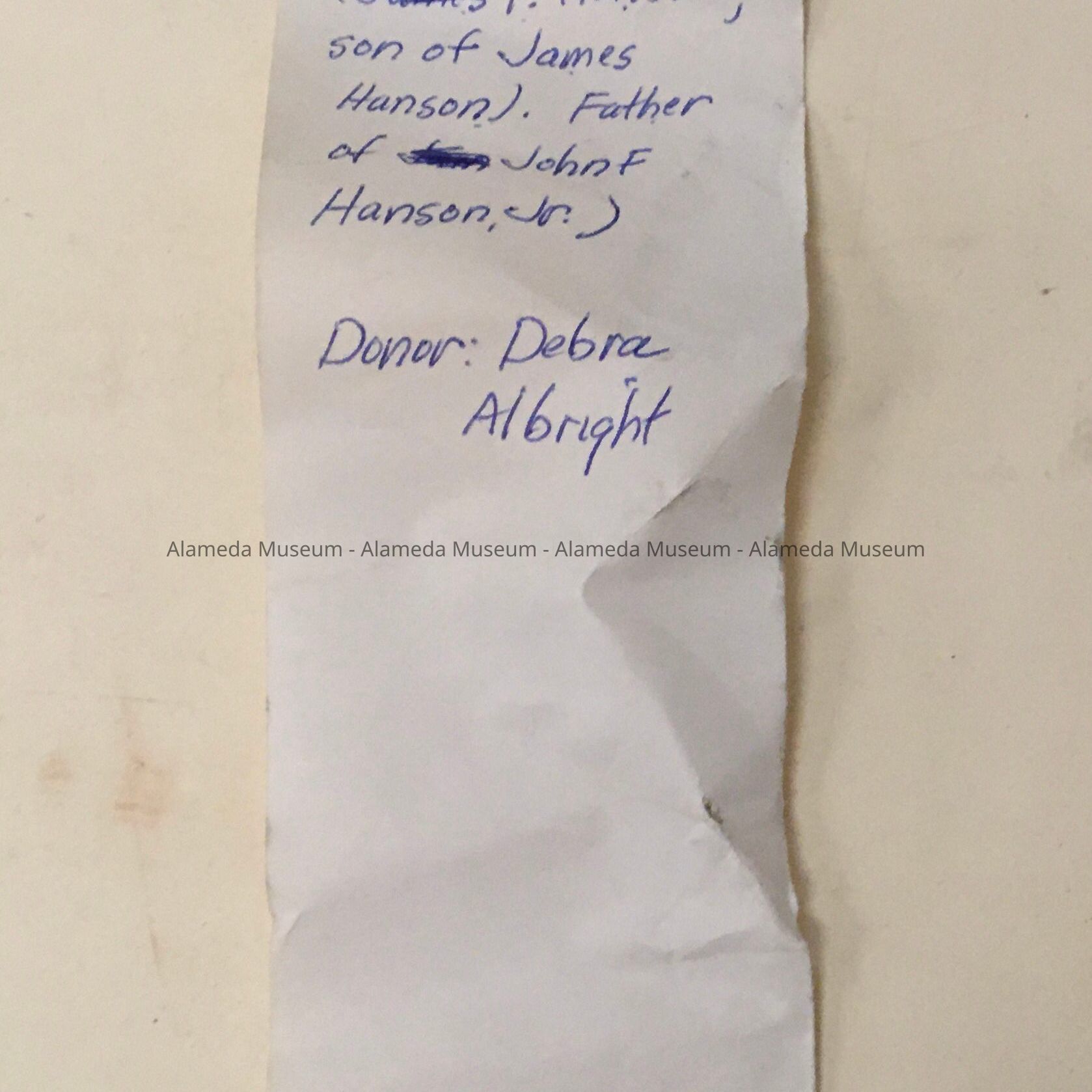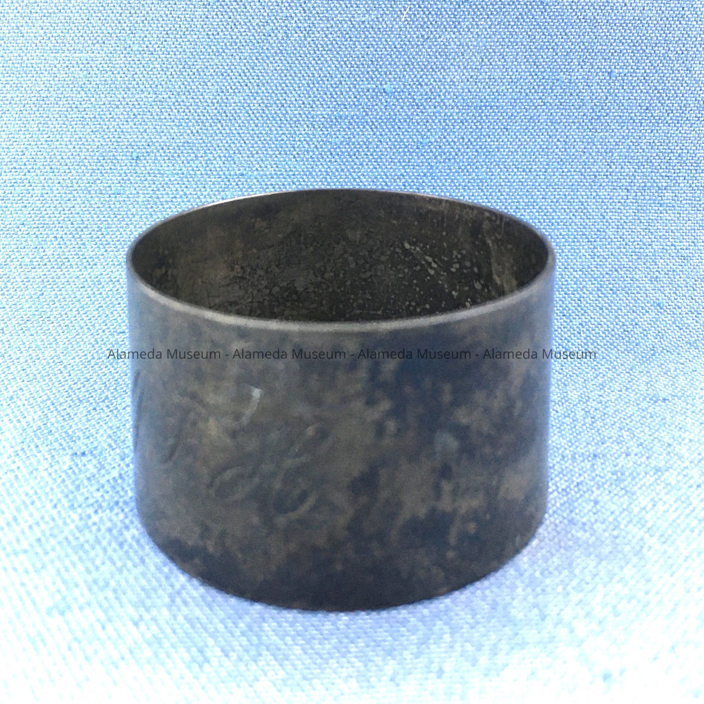 History: Napkin ring belonging to John F. Hanson, son of James Hanson of 2204-06 Buena Vista Avenue. John F. ran a cigar store on Park Street for many years. He was a member of a family that came to Alameda as early as 1875.
