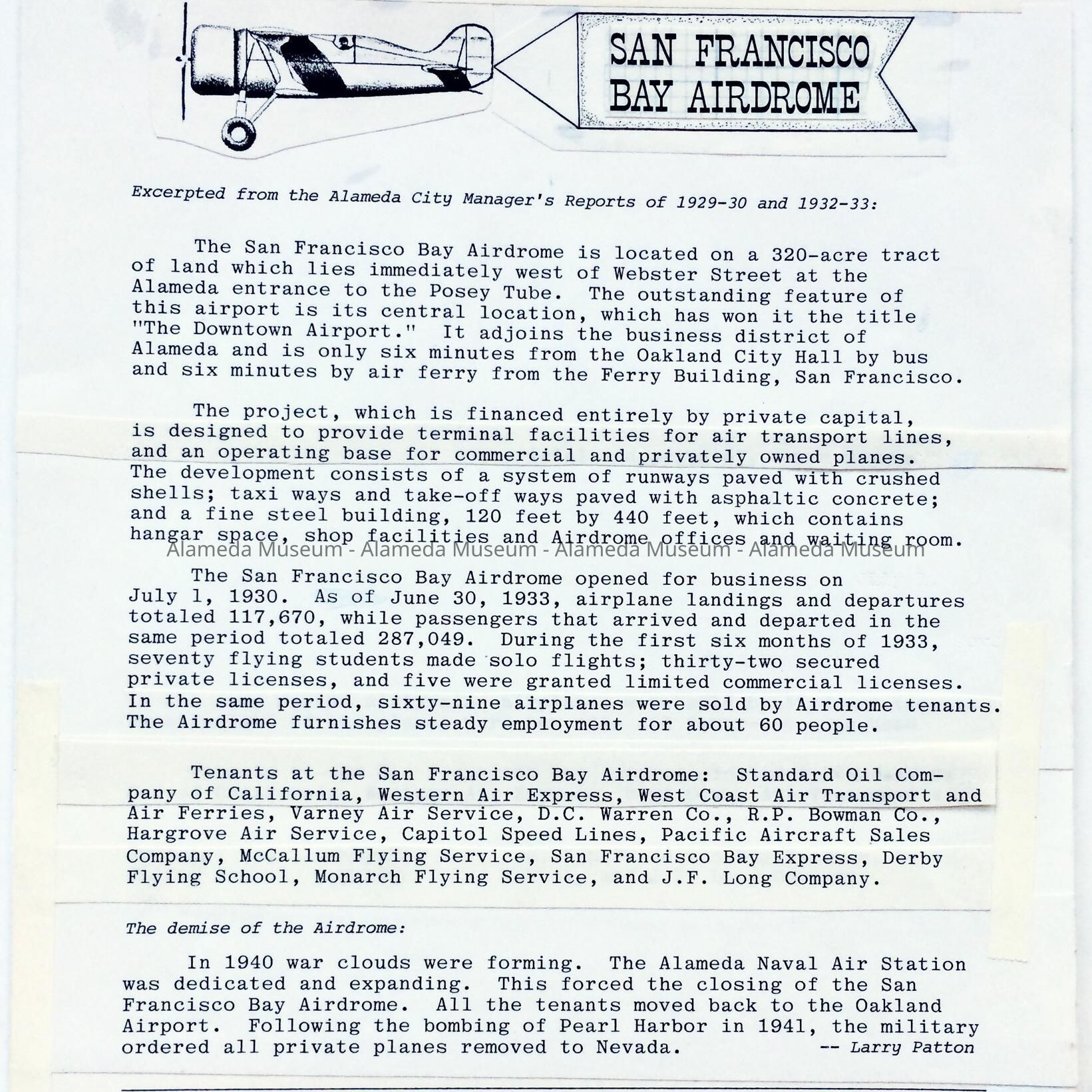 NARRATIVE CONCERNING THE HISTORY OF THE SAN FRANCISCO BAY AIRDROME. NARRATIVE WAS CREATED FOR AN EXHIBIT THAT WAS DISPLAYED IN THE ALAMEDA HISTORICAL MUSEUM, FEATURING AVIATION IN THE PERIOD 1984-85.