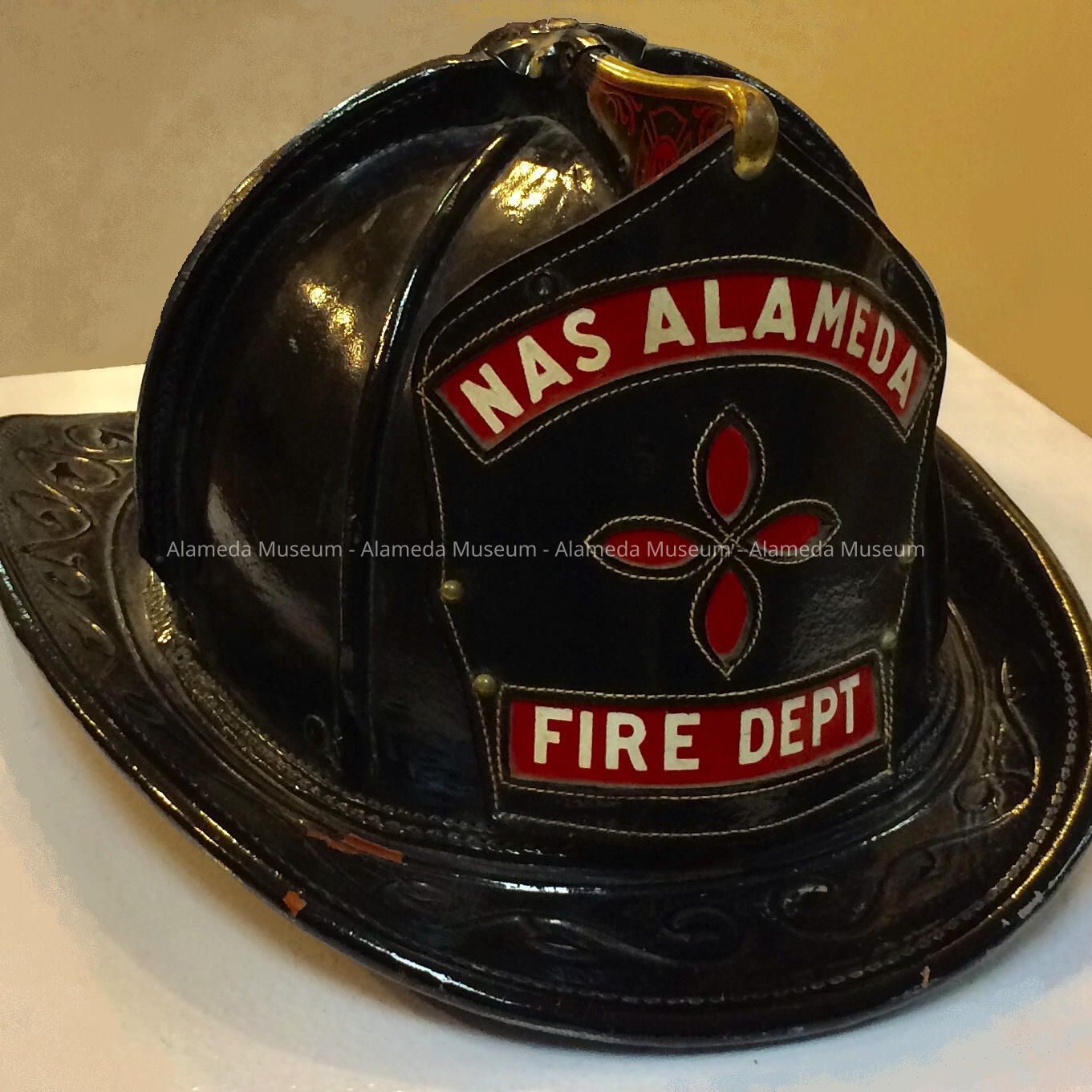 DESCRIPTION: A HELMET WHICH APPEARS TO BE LAMINATED LEATHER AND CANVAS. HELMET HAS A KEYSTONE SHAPED EMBLEM FACING FRONT WITH INSET HORIZONTAL PANELS WITH WHITE COLORED LETTERS ON A RED COLORED BACKGROUND STATING, "NAS, ALAMEDA FIRE DEPARTMENT." THE EMBLEM IS ATTACHED TO A BRASS FLANGE WITH A LABEL IN RED COLORED TYPE WITH THE INITIALS, "F. D." EXTERIOR IS FINISHED IN A BLACK PAINTED FINISH. THE INTERIOR HAS THE ORIGINAL TIN LABEL STATING, "CAIRNS AND BROS., INC, CLIFTON, NJ."