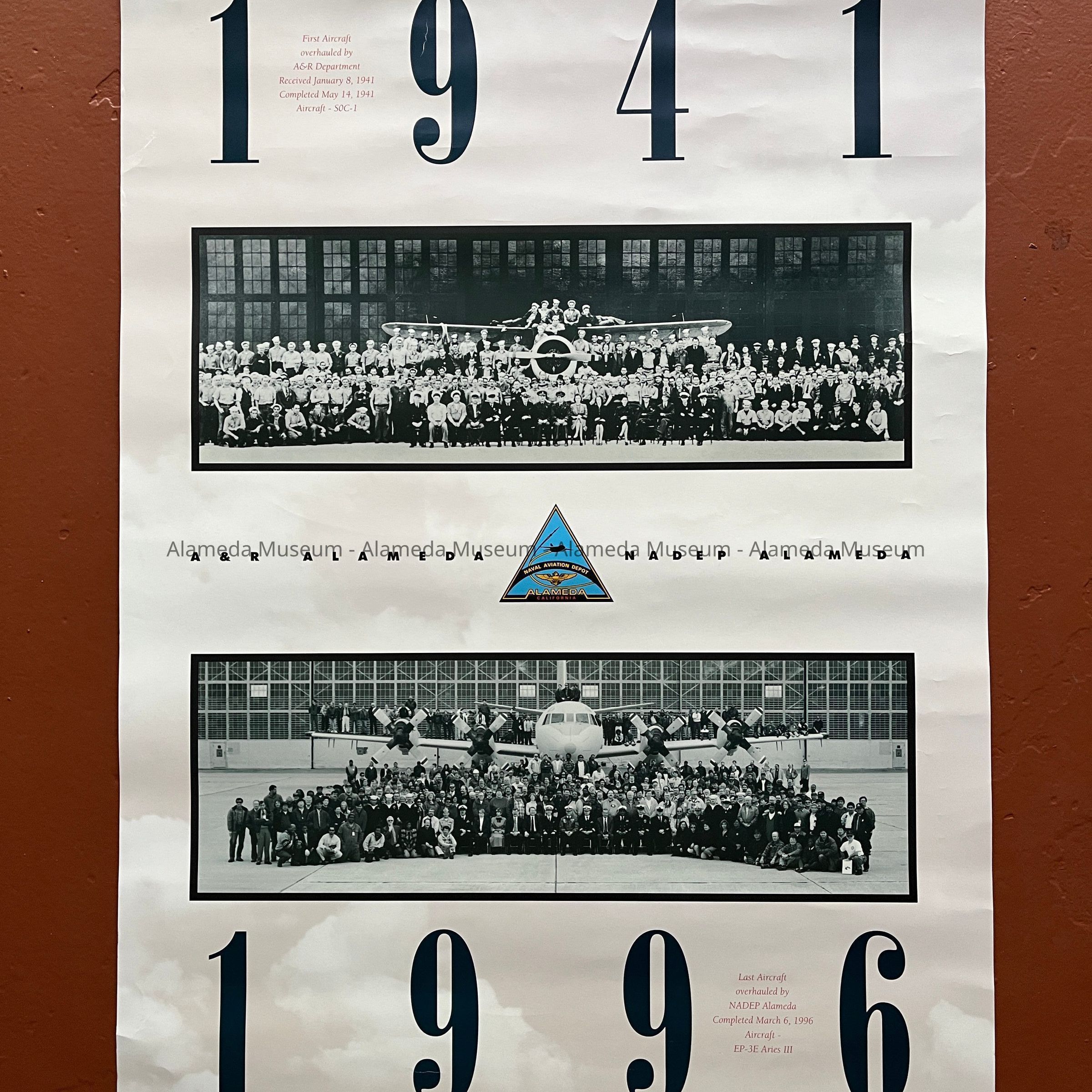 History of Object: poster created to commemorate the departments that were stationed at NAS from 1941 until its closure in 1996. The top photo shows the full A&R Department after the first aircraft was overhauled on May 14, 1941 (aircraft SOC-1); the second photo was taken to commemorate the last aircraft overhauled by NADEP Alameda on March 6, 1996 (EP-3E Aries III).