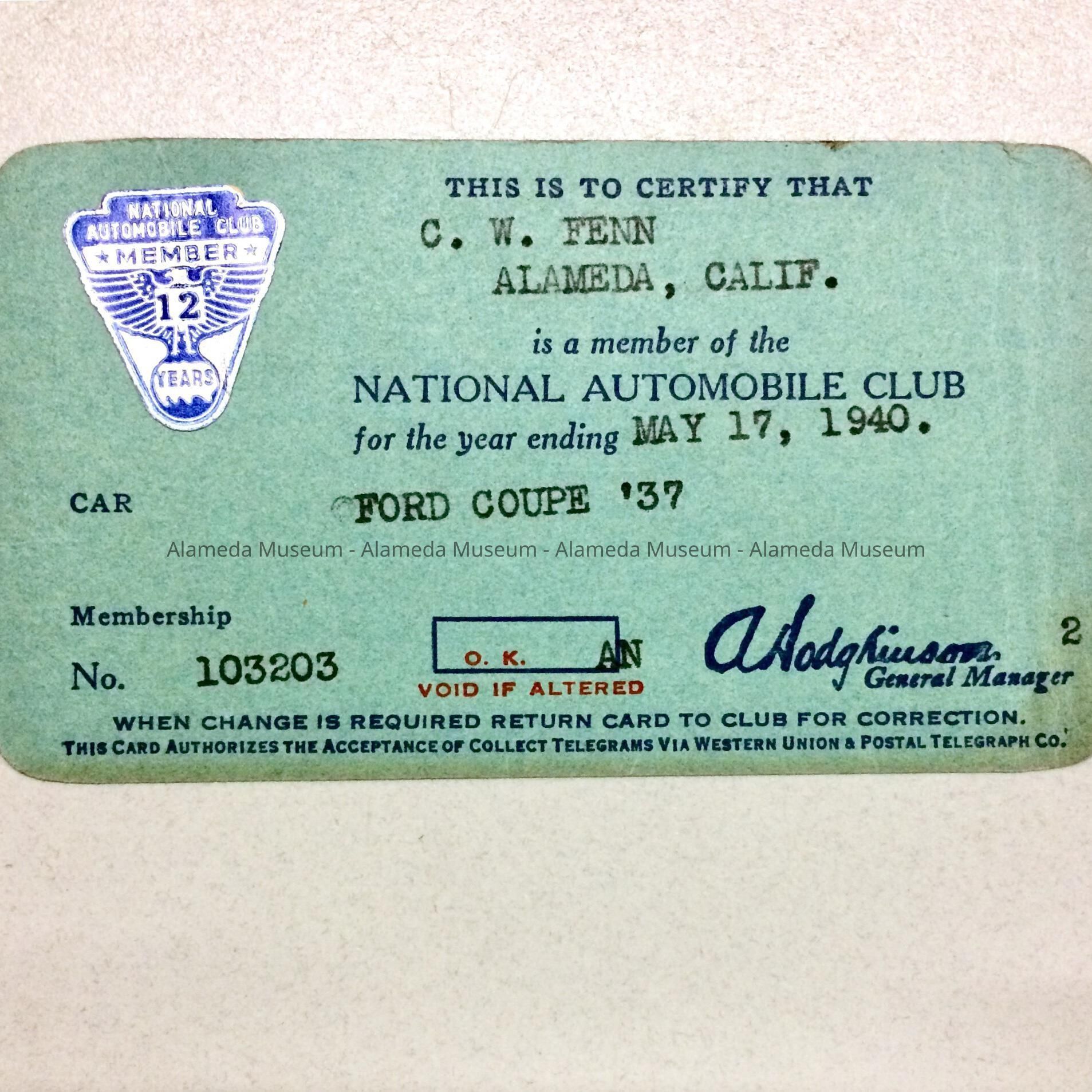 Nationa Automobile Club Membership Card issued to C.W. Fenn, 1940Entry/Object ID