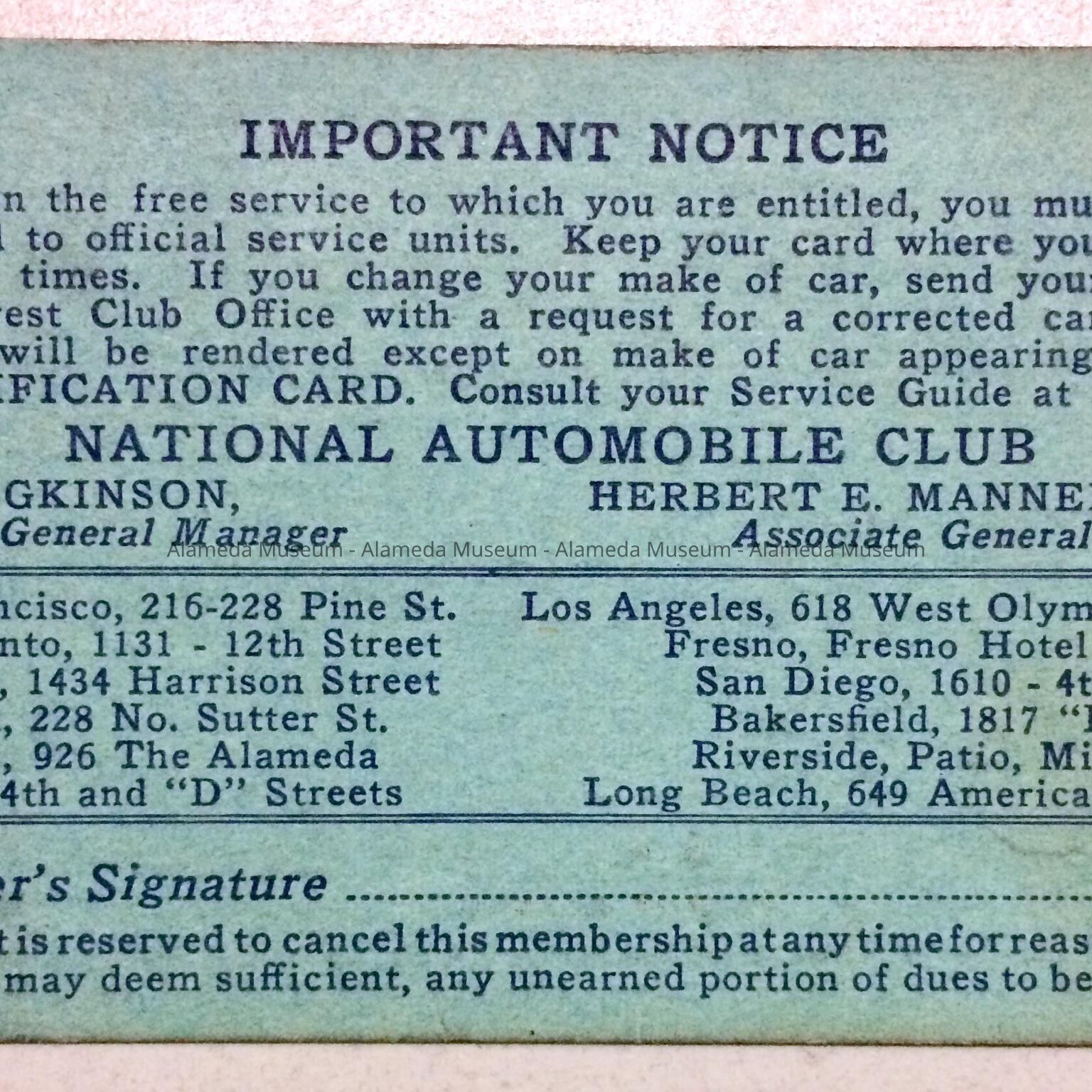 HISTORY OF OBJECT: A MEMBERSHIP CARD ISSUED BY THE NATIONAL AUTOMOBILE CLUB TO C. W. FENN, SON OF ERNEST FENN.