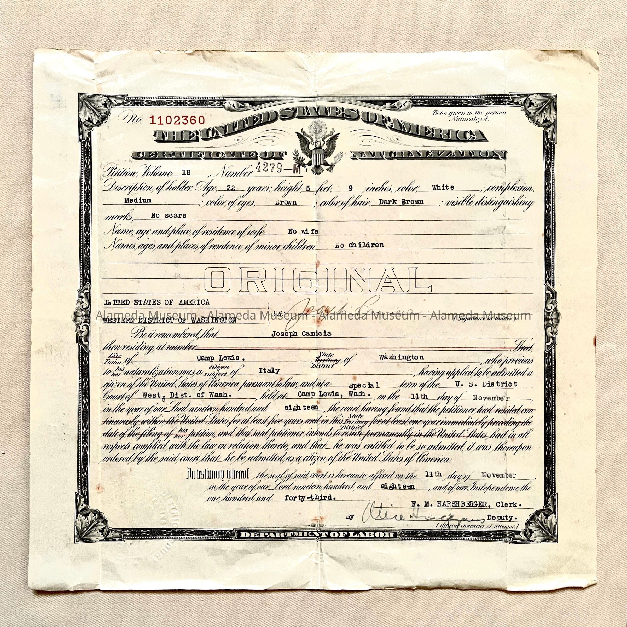 Naturalization Certificate of Joseph Camicia, 1918Entry/Object ID