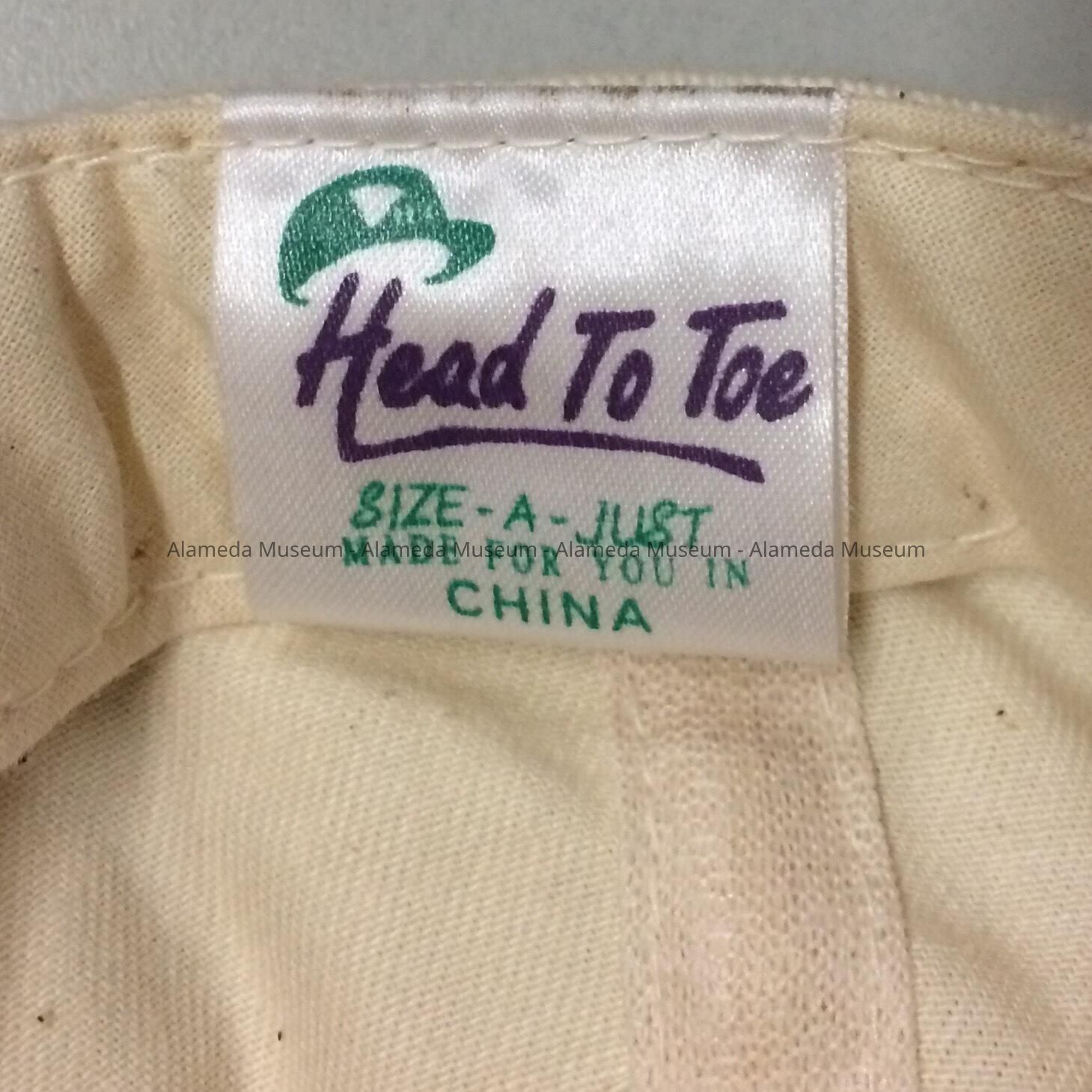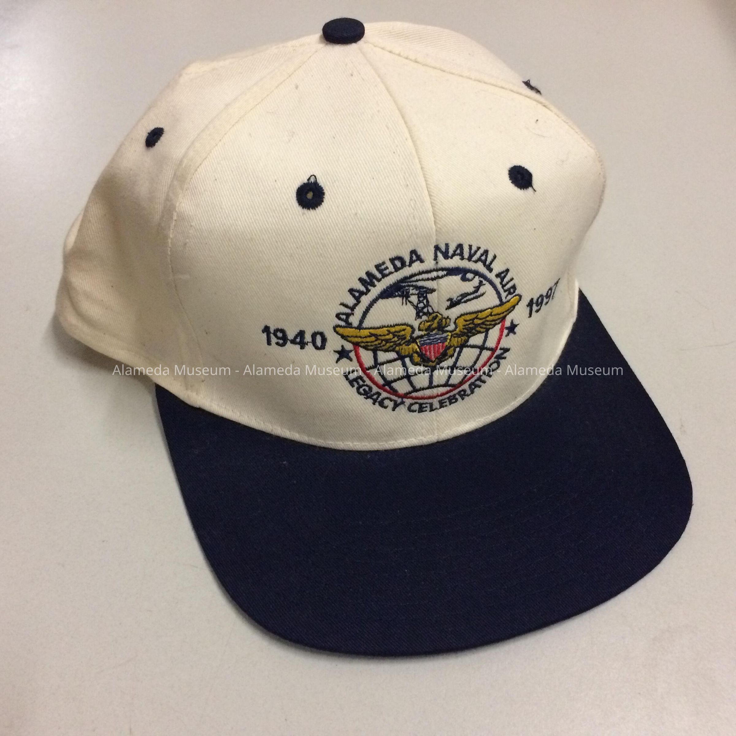 Description: 6-panel baseball-style cap of off-white canvas with a navy-blue bill, and machine-embroidered emblem stating: 'Alameda Naval Air Legacy Celebration 1940-1997. Label identifies the hat as made in China.