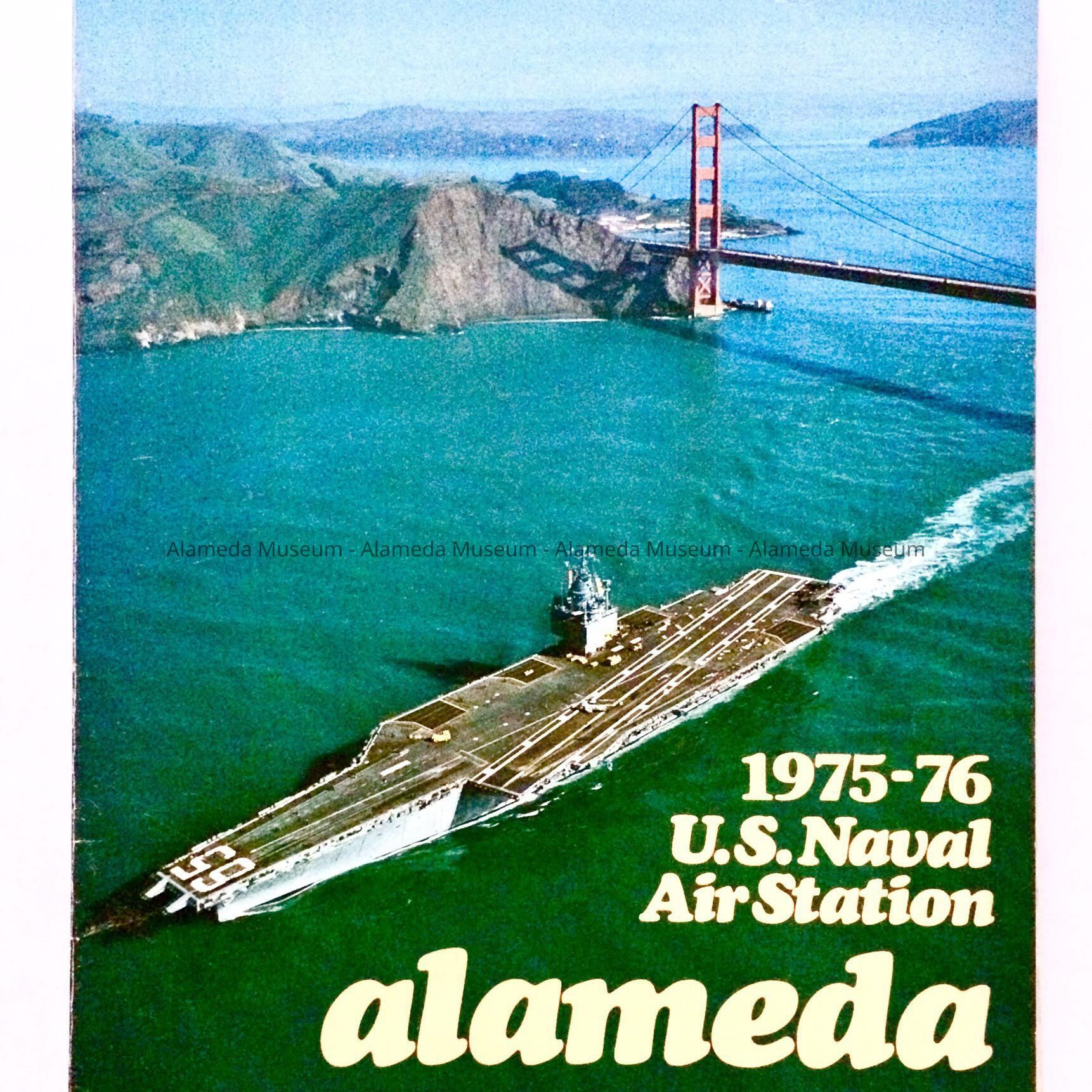 Description: Soft bound magazine with colored photographic cover depicting an AirCraft carrier with the Golden Gate Bridge. Cover also includes bold printed caption “1975-76 U.S. Naval Air Station, Alameda.