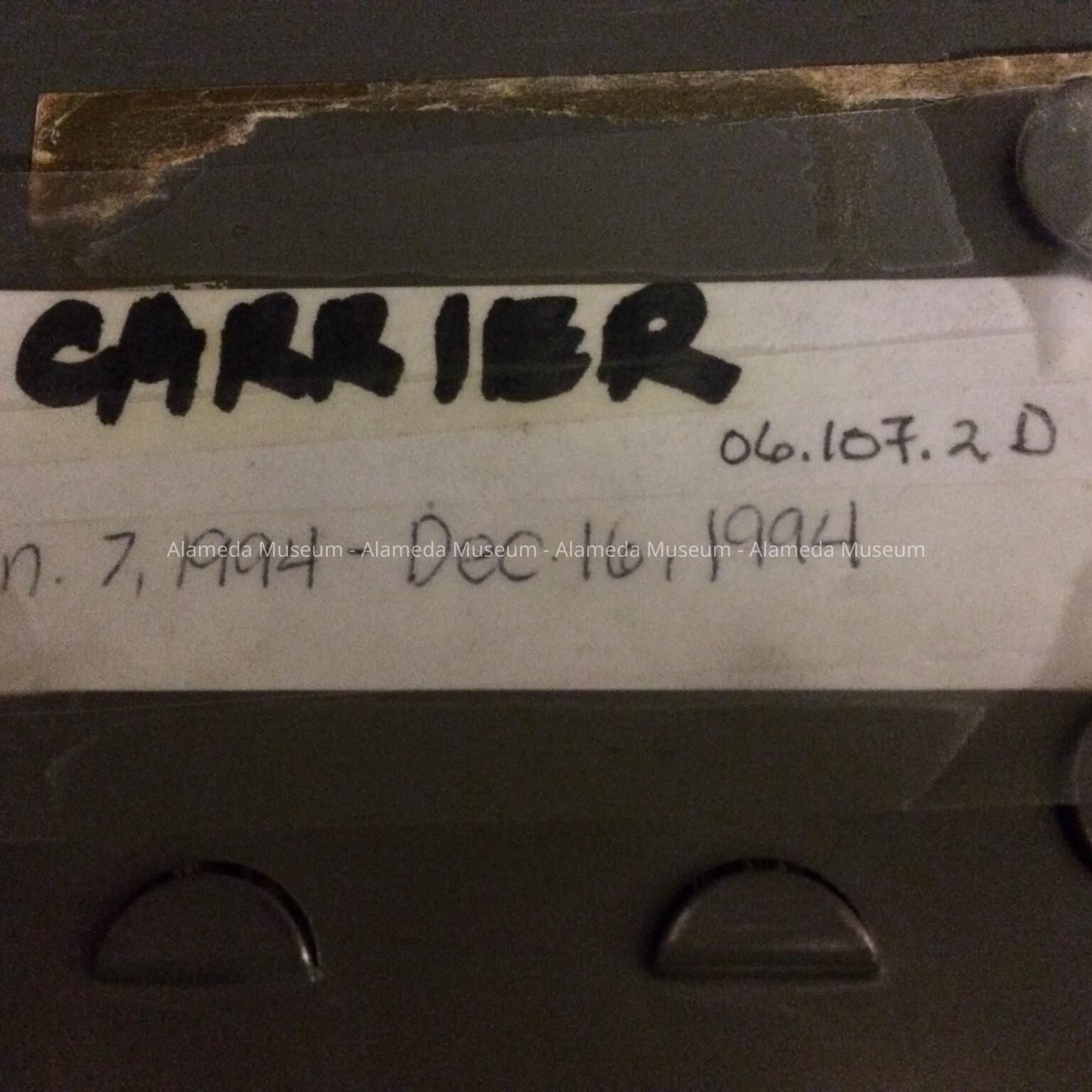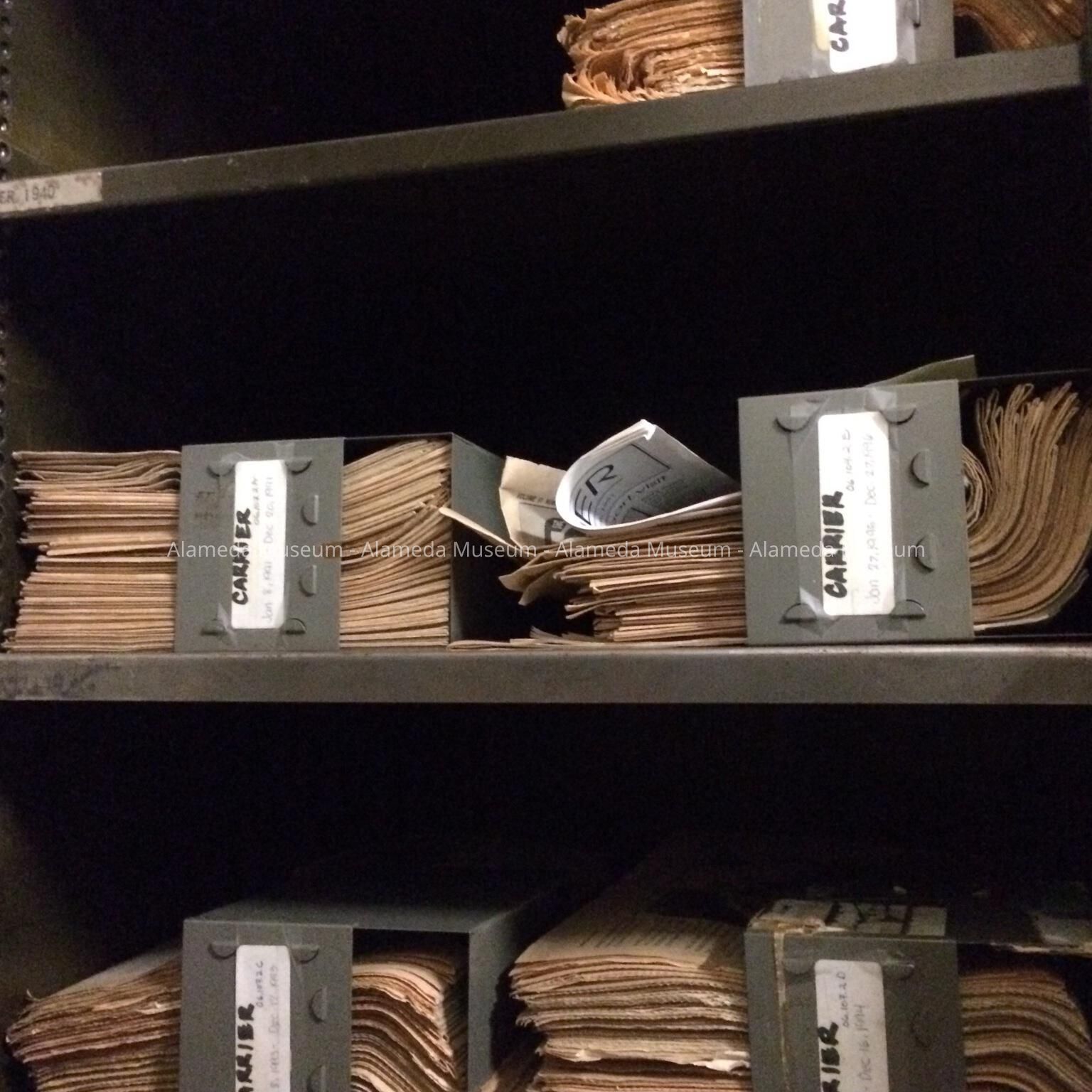 HISTORY OF OBJECTS: THE "CARRIER," ISSUED BY THE ALAMEDA NAVAL AIR STATION (1991 THROUGH 1996), CONTAINED IN GRAY-COLORED METAL BOXES. THEY WERE PART OF REFERENCE MATERIAL OF THE ALAMEDA FREE LIBRARY.