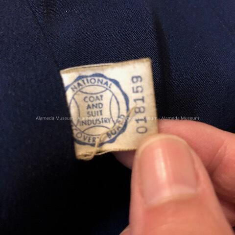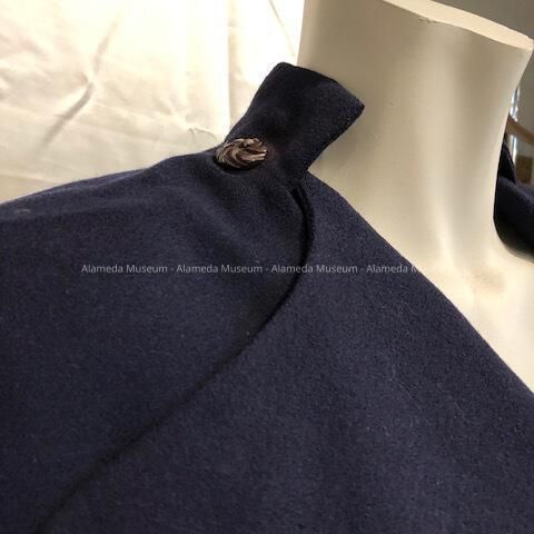 Navy blue wool crepe coat with short removable cape. Interior label states "Charles of California."